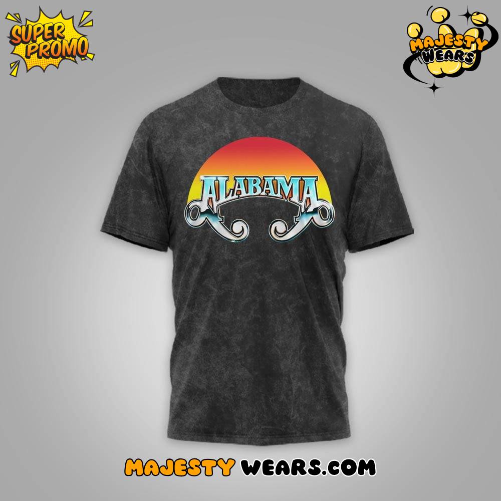 The visual aesthetic of the Alabama Band Live in Concert T-Shirt features a striking front graphic that utilizes a nostalgic sunset color palette. Centered on the chest of the Alabama Band Live in Concert T-Shirt, the iconic band logo is rendered in a clean, retro-styled font that evokes the group’s classic 1980s era. This primary design on the Alabama Band Live in Concert T-Shirt provides a timeless look that is instantly recognizable to any country music fan, blending vintage charm with modern printing techniques for a sharp and professional finish.