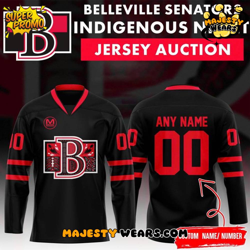 The visual identity of the Belleville Senators 2026 Indigenous Community Night Custom Hockey Jersey is defined by its striking black and red base, accented by intricate Indigenous-inspired artwork. A central feature is the primary crest on the chest, which reimagines the iconic Senators logo through traditional artistic techniques and symbolic patterns. This Belleville Senators 2026 Indigenous Community Night Custom Hockey Jersey also includes unique shoulder patches that incorporate local community motifs, serving as a poignant nod to the solidarity shared between the hockey club and the Mohawks of the Bay of Quinte.