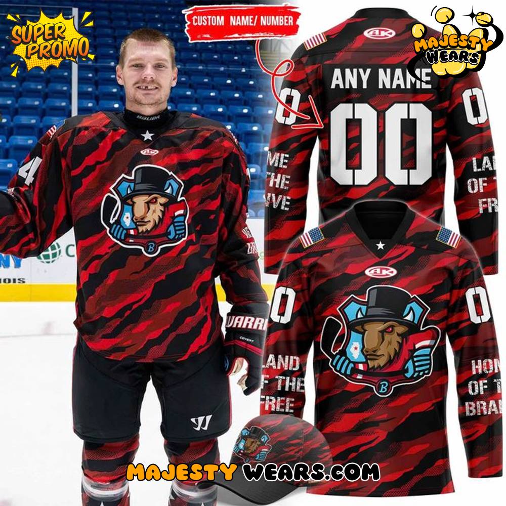 This high-impact Custom Hockey Jersey is designed to replicate the unique look of the game-worn versions from the special theme night, offering fans a high-quality, memorable collectible. The jersey’s vibrant red and black tiger-stripe camouflage pattern showcases our Expertise in reproducing complex, meaningful designs while ensuring durability and comfort. This is an essential item for any dedicated fan of the Bloomington Bison who values the team’s connection to its community and its commitment to honoring military heroes. Secure this patriotic piece and proudly display your allegiance to both your team and your country.