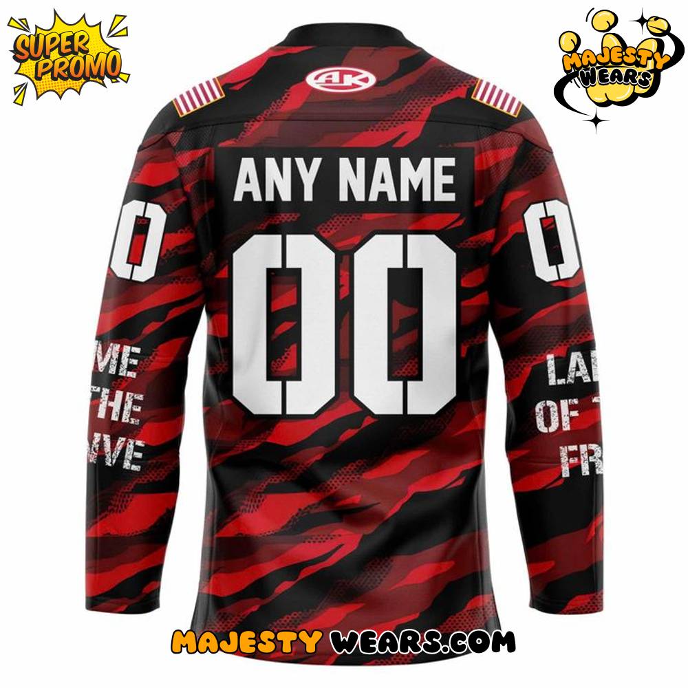 Key patriotic details are integrated throughout the design, reinforcing the Military Appreciation Night theme. Along the lower sleeves and bottom hem, large white block lettering against the red camo spells out phrases like “LAND OF THE FREE” and “HOME OF THE BRAVE,” ensuring the message of gratitude is prominently displayed. Furthermore, small American flag patches are placed on the shoulders, a detail that clearly communicates the Trustworthiness and sincerity of the tribute. These graphic elements are seamlessly incorporated into the camo background, creating a cohesive and visually powerful Custom Hockey Jersey.
