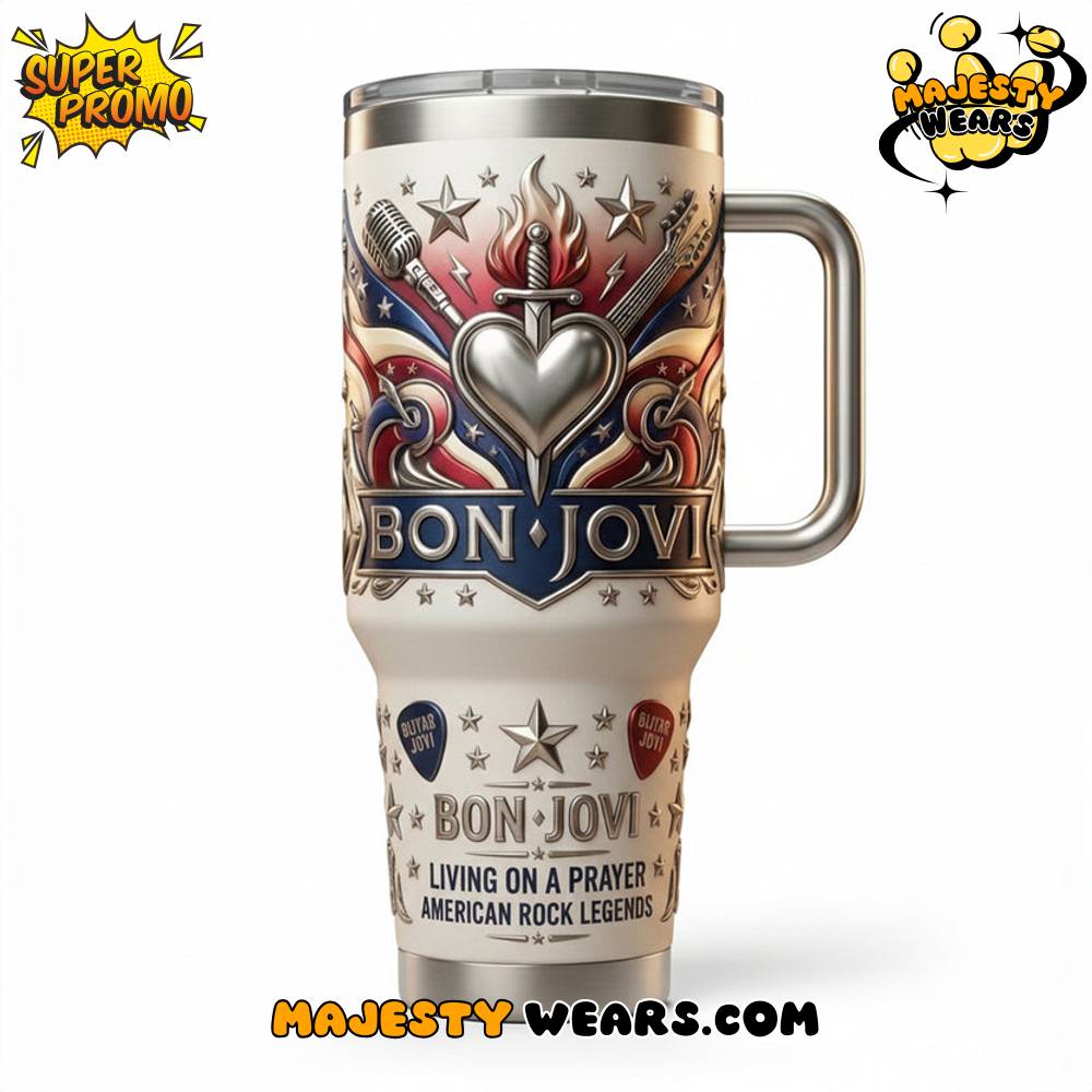 The visual design of the Bon Jovi “American Rock Legends” YETI Tumbler is a stunning display of rock-and-roll art, featuring the iconic “Heart and Dagger” logo prominently on the front. This Bon Jovi “American Rock Legends” YETI Tumbler showcases vibrant colors against a clean, off-white background, framed by stylized stars and stripes that reinforce the “American Rock Legends” theme. The detailed graphics on the Bon Jovi “American Rock Legends” YETI Tumbler are applied with a durable finish to ensure they don’t peel or fade, even with frequent use and washing.