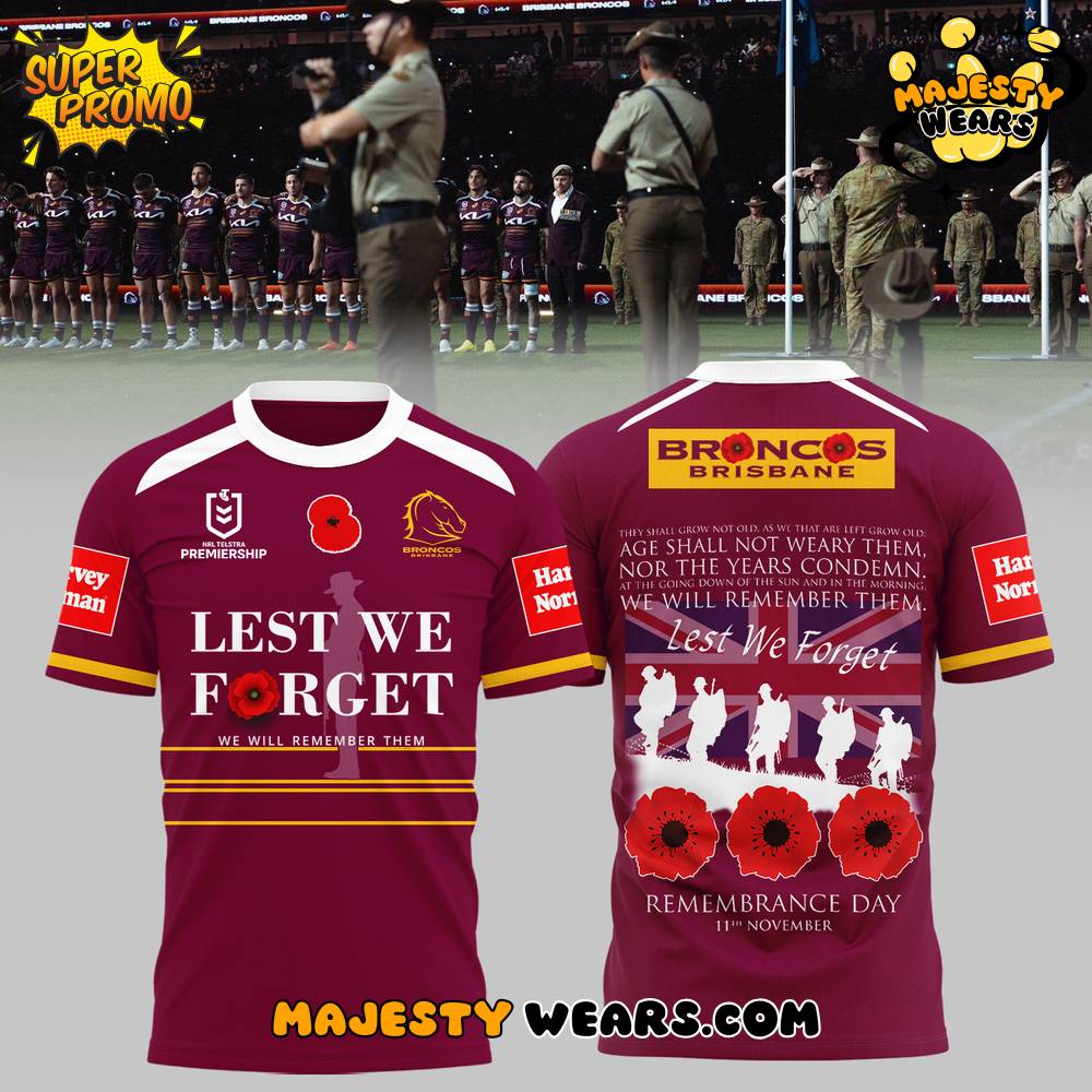 The design of the Brisbane Broncos Lest We Forget Special Tee is rich in symbolic meaning, masterfully balancing the club’s identity with the national significance of Remembrance Day. The front of the jersey boldly features the powerful, central phrase “Lest We Forget” in a clean, legible font, often complemented by the smaller, equally important pledge, “WE WILL REMEMBER THEM”. Crucially, the red poppy symbol is prominently displayed alongside the Brisbane Broncos crest, providing an immediate visual connection to the sacrifices honored on 11th November and establishing the shirt’s profound purpose.