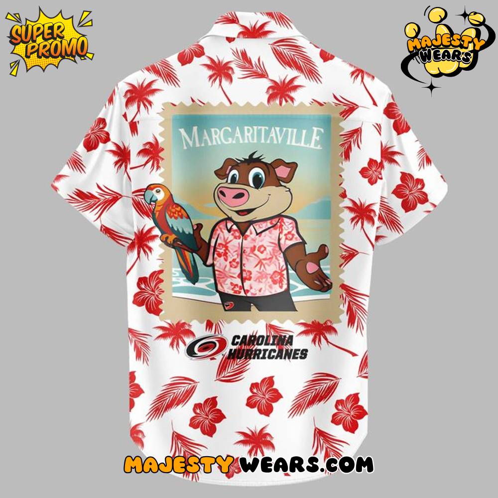 The design of the Carolina Hurricanes x 2025 Margaritaville Night Special Hawaiian Shirt is a masterful fusion of NHL iconography and Jimmy Buffett’s beach-inspired aesthetic, showcasing a lively all-over print in the team’s signature red and white. The front features a vibrant pattern of red hibiscus flowers, palm fronds, and the unmistakable Carolina Hurricanes primary logo and secondary “C-Canes” hurricane logo, subtly woven into the tropical backdrop. Over the left chest pocket, the ‘Canes mascot, Stormy, is prominently featured in a charming, casual pose, wearing a tropical hat and shorts, clearly signaling this as the official Margaritaville Night Special Hawaiian Shirt for the 2025 event.