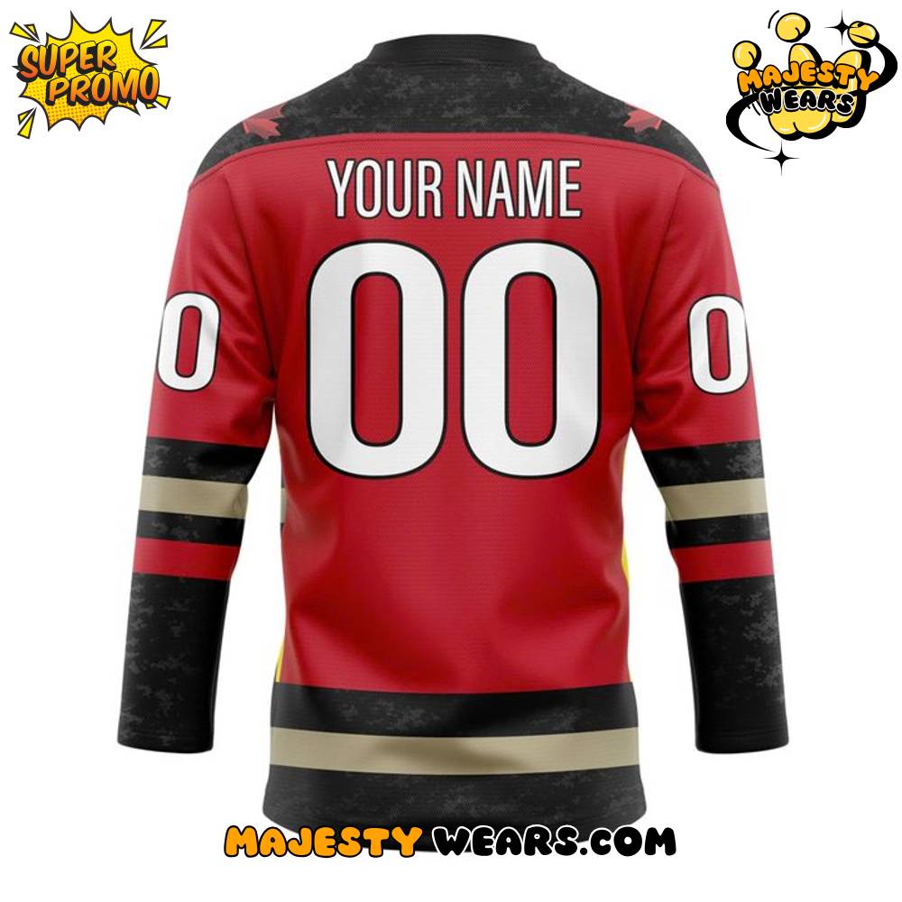 The design of the Charlottetown Islanders Military Night Appreciation Custom Hockey Jersey beautifully integrates the team’s classic red and black color scheme with elements of military tribute, creating a look that is both striking and respectful. As seen in the attached image, the rich red body provides a bold base, powerfully contrasting with the black sleeves and the military-inspired accents. The distinctive Islander logo is proudly displayed on the chest, a clear signal of your Charlottetown Islanders fandom, while the overall aesthetic carries the weight of patriotic honor, making this a profoundly meaningful custom hockey jersey.