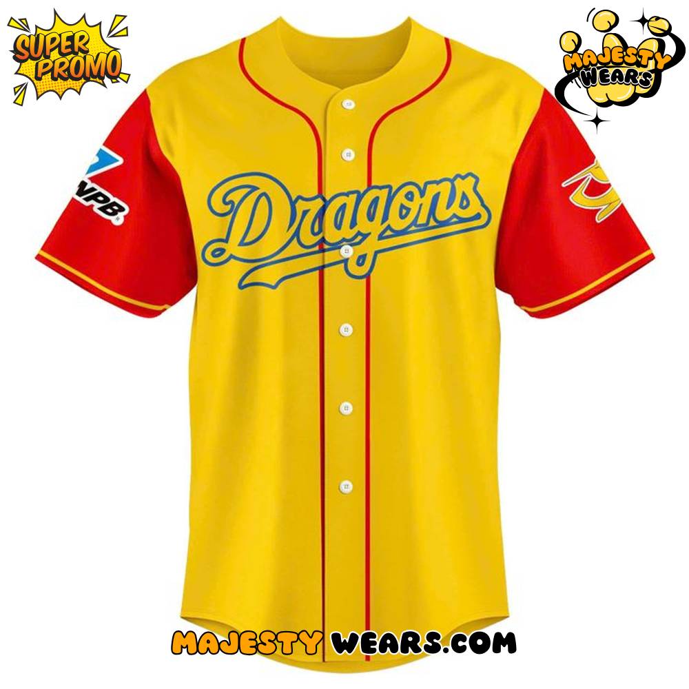 The aesthetic of the Chunichi Dragons x Pokémon 30th Anniversary Baseball Jersey is a bold celebration of vibrant colors and iconic team branding. Featuring a bright yellow primary body inspired by Pikachu’s signature hue, the Chunichi Dragons x Pokémon design is accented with striking red sleeves for a modern, high-contrast look. The front showcases the traditional “Dragons” cursive script in a deep blue with yellow outlining, a classic nod to the team’s heritage integrated into the Pokémon 30th Anniversary Baseball Jersey theme. Red piping highlights the placket and collar, providing a sharp finish that maintains the professional silhouette of an official NPB replica jersey.