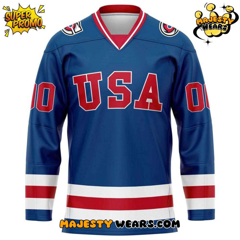 The most prominent feature of this Cincinnati Cyclones “MIRACLE 26” Custom Hockey Jersey is the lettering across the chest. Instead of the typical Cyclones logo, the jersey features bold, block letters spelling “USA” in red and white, a direct reference to the unforgettable jerseys worn by the 1980 Olympic team. Below this lettering is the option for the number 00 in red and white. While the team’s own ‘C’ logo is present on the shoulders, the central focus on the national identifier ensures the tribute’s clarity and emotional impact. The quality of the stitching and material used reflects the official, high-caliber nature of a custom hockey jersey designed for a major promotional event.