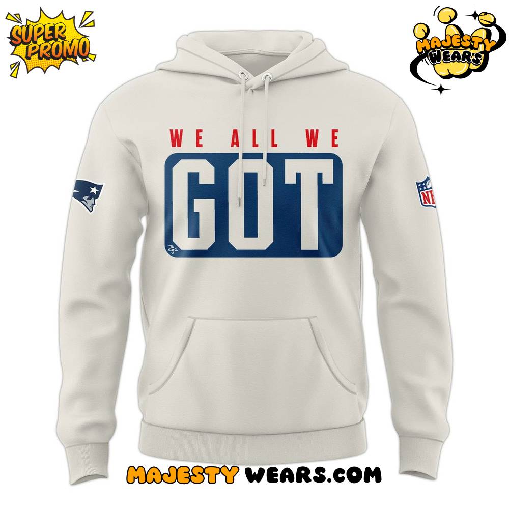 The visual identity of the Coach Mike Vrabel New England Patriots “We All We Got, We All We Need” Hoodie is defined by its clean, bone-white base and bold, block-lettering graphics. On the front, the Coach Mike Vrabel New England Patriots “We All We Got, We All We Need” Hoodie features the word “GOT” in a massive, navy-blue font, accented by the motivational phrase “WE ALL WE” printed in vibrant red. This striking contrast on the Coach Mike Vrabel New England Patriots “We All We Got, We All We Need” Hoodie ensures the message of team solidarity is instantly recognizable from the stands or on camera.