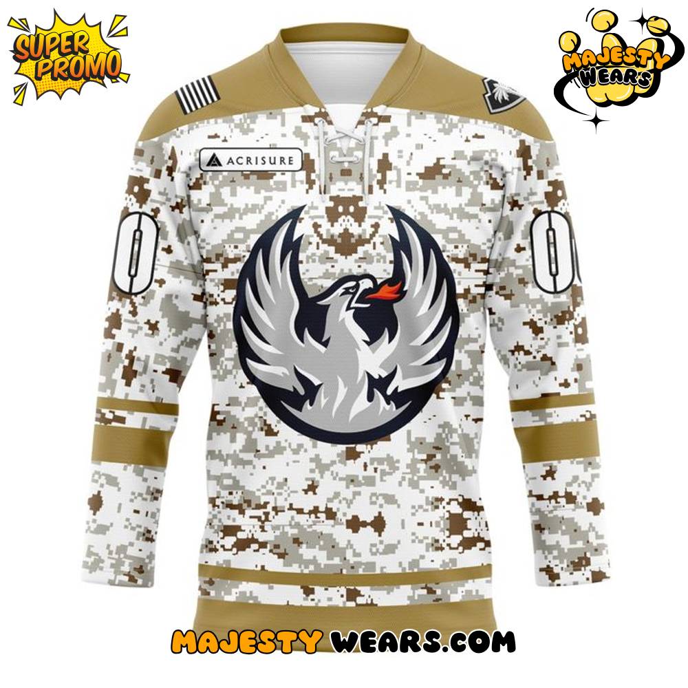 Central to the design is the modified team crest. The Firebirds’ primary logo—the majestic bird—is boldly displayed over the camouflage, typically rendered in white, silver, and black to provide a clean, powerful contrast. The color accents on the collar, cuffs, and waist, often in an olive or tan shade, further complement the military desert theme, tying the entire look together. The commercial sponsor’s logo, present on the chest, seamlessly integrates with the overall design, demonstrating the high-quality, authentic look of the Coachella Valley Firebirds Military Appreciation jersey.