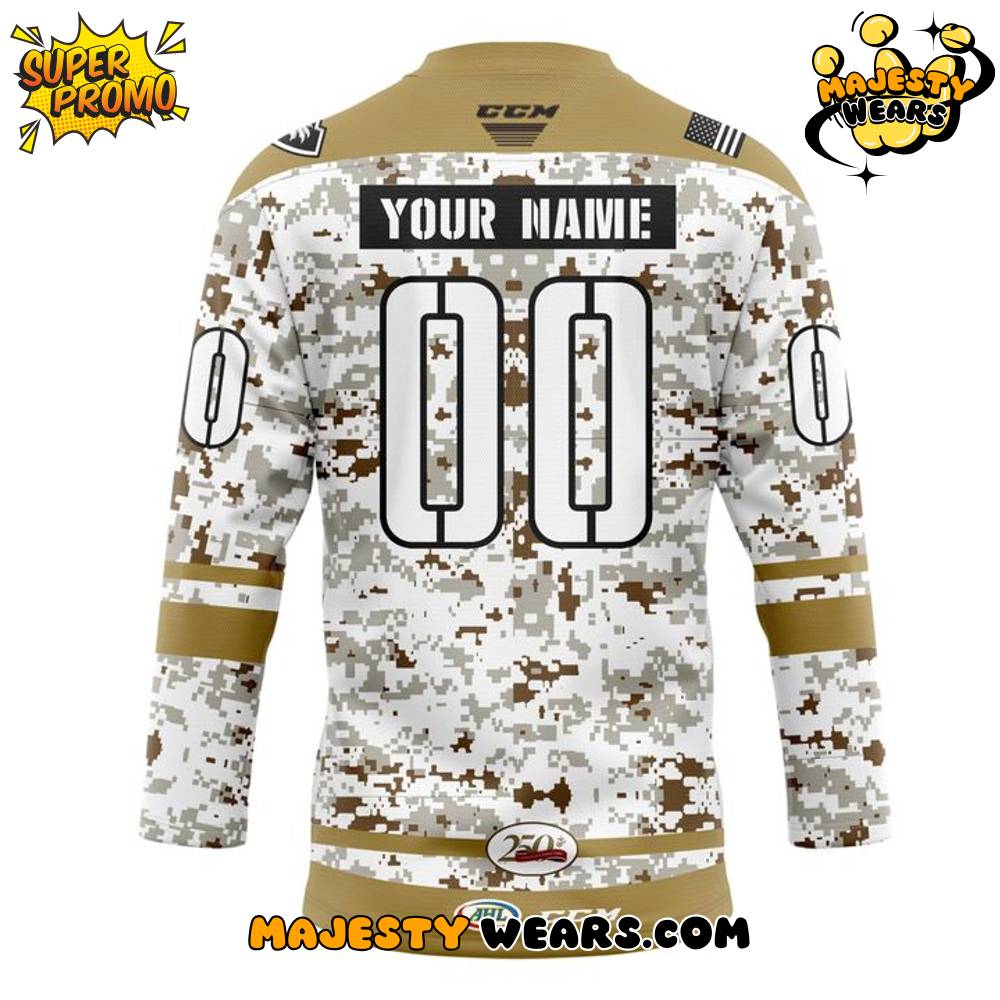 The shoulders of the Coachella Valley Firebirds Military Night Appreciation 2025 Custom Hockey Jersey feature epaulet-like stripes and sometimes a patch resembling a flag or military insignia, adding authentic visual expertise to the garment. The back of the jersey showcases the custom hockey jersey personalization, with the Your Name and large number 00 applied in a bold, military-stencil-style font, often in white or black for maximum readability over the camouflage. This attention to detail ensures that this Coachella Valley Firebirds Military Appreciation jersey is a respectful and eye-catching tribute on or off the ice.