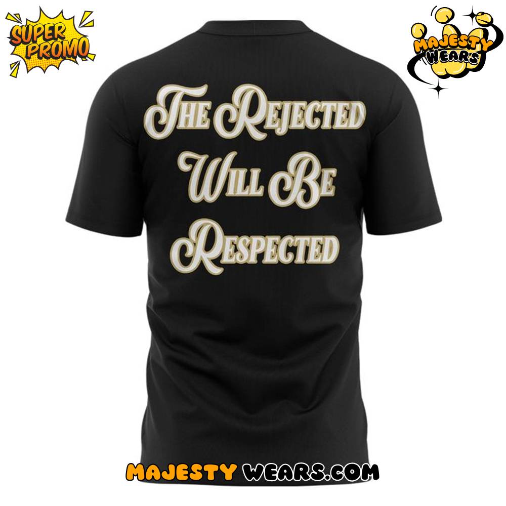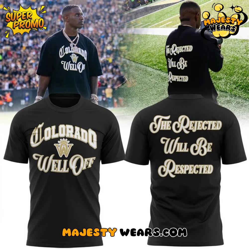 The reverse side of the Colorado “Well Off” T-Shirt carries a second, equally powerful message that aligns with the motivational narrative surrounding the team: “THE REJECTED WILL BE RESPECTED“. This slogan is printed in a beautiful, prominent script, emphasizing the theme of overcoming adversity and proving doubters wrong—a message instantly understood by those with Expertise in the team’s recent history. The continuity of the gold and white lettering on the black background ensures the entire design is cohesive, high-impact, and a true statement of Trustworthiness in the team’s resolve.