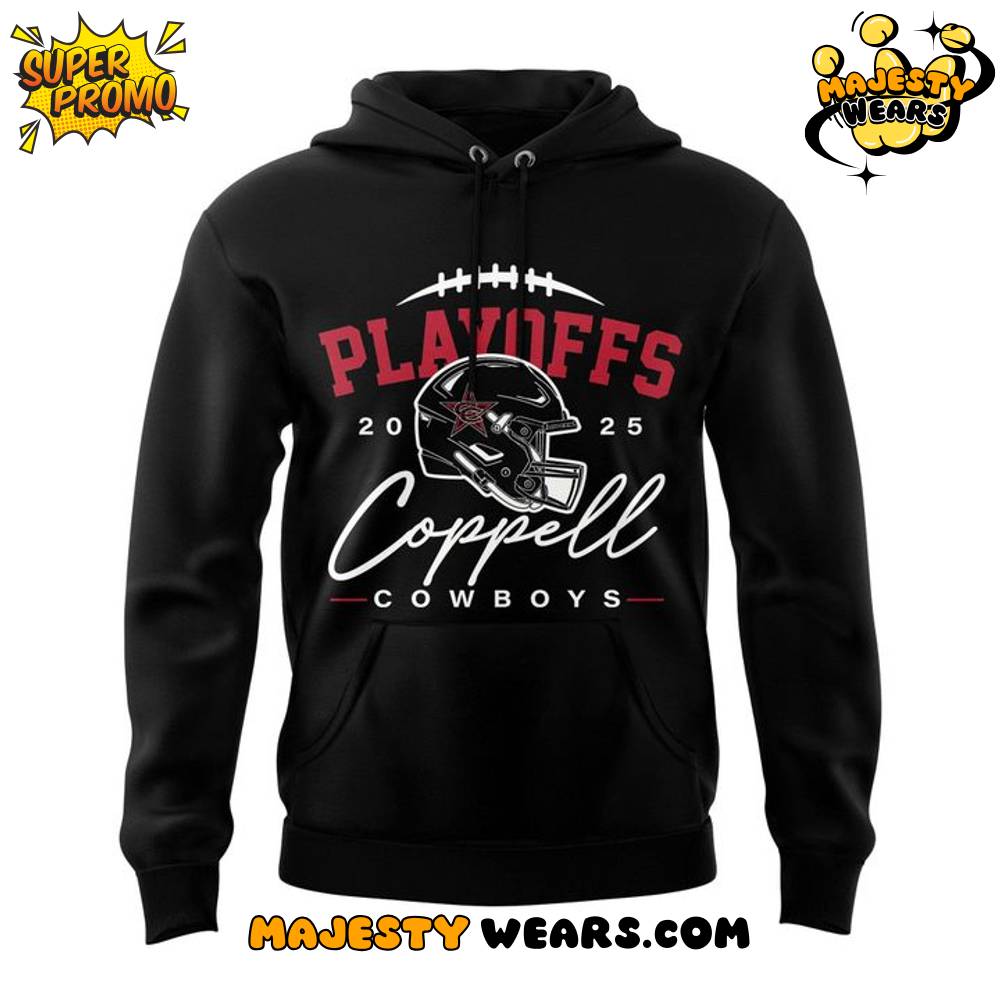 The visual identity of the Dallas Cowboys “Coppell” 2025 Playoffs Special Hoodie is defined by a sleek black base that allows the vibrant red and white graphics to pop with intense clarity. On the front, the Dallas Cowboys “Coppell” 2025 Playoffs Special Hoodie features a large “PLAYOFFS 2025” text arching over a detailed graphic of a football helmet, which is flanked by the year to commemorate the specific season. Below this, the word “Coppell” is rendered in a stylish white script, followed by the “COWBOYS” team name in a bold, capitalized font. This layered typography gives the Dallas Cowboys “Coppell” 2025 Playoffs Special Hoodie a high-end, custom-made feel that is standard for elite playoff merchandise.
