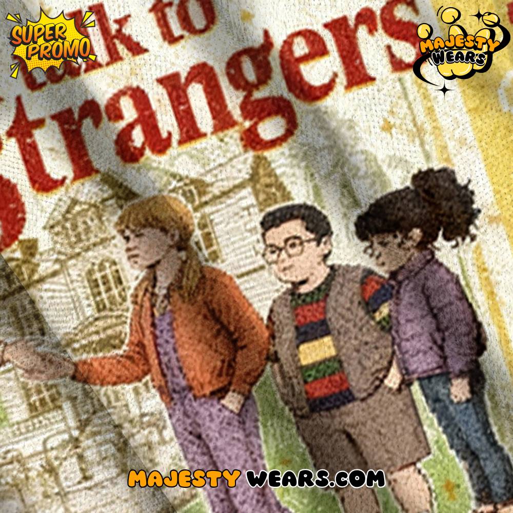 The Don’t Talk To Strangers Safety Education Ugly Christmas Sweater is a uniquely nostalgic piece of apparel that blends retro public service announcement aesthetics with the festive spirit of the holiday season. This garment serves as a conversation starter at any holiday gathering, offering a humorous yet slightly dark take on the classic childhood lessons we all remember from the 1980s and 90s. By wearing the Don’t Talk To Strangers Safety Education Ugly Christmas Sweater, you are showcasing a sense of irony and vintage style that stands out from the typical reindeer and snowflake patterns. It is the perfect choice for those who appreciate “dark humor” mixed with “retro vibes” during the winter festivities.