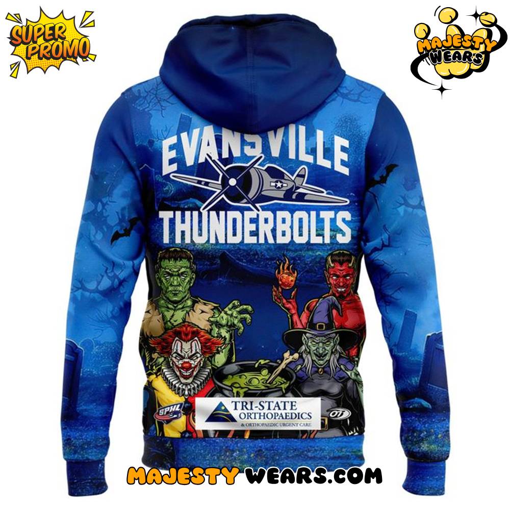 The team identity is prominently maintained within the chaotic scene, with the EVANSVILLE THUNDERBOLTS name and the signature airplane logo flying boldly across the chest. The blue color of the hoodie and the background graphics evokes a spooky, moonlit night, ensuring the team’s name stands out clearly in white lettering. This expert integration of official team elements with the detailed horror artwork confirms the item’s status as authentic Thunderbolts merchandise.