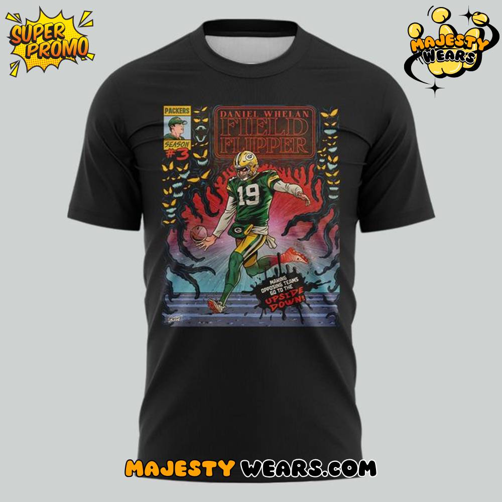 Step into the extraordinary world of football fandom with the Green Bay Packers Daniel Whelan x Stranger Things T-Shirt, a truly unique and limited-edition piece of fan gear. This exclusive black tee celebrates the Green Bay Packers punter, Daniel Whelan (number 19), by ingeniously blending the excitement of the NFL with the iconic aesthetic of the hit Netflix series Stranger Things. Whelan, the first Irish-born NFL player since 1985, has been recognized for his ability to “flip the field”, a play on words perfectly captured by the shirt’s theme. Secure this highly collectible item to demonstrate your expertise and commitment to both pop culture and the legendary Green Bay Packers franchise.