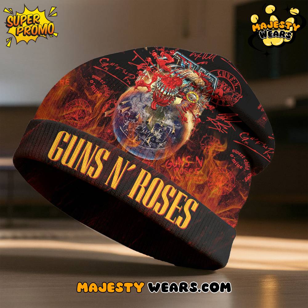 The visual design of the Guns N’ Roses Beanie Hat is truly spectacular, featuring a full-print graphic that covers the entire crown with iconic band imagery. At the center of the design, the Guns N’ Roses Beanie Hat showcases a detailed earth graphic surrounded by the band’s legendary roses and thorns motif. This intricate artwork is rendered in high-definition, capturing the vivid reds and golds that have defined the band’s aesthetic for decades. The top section of the Guns N’ Roses Beanie Hat is further accented with a “sweet child o’ mine” text script and classic band signatures, providing an authentic, tour-inspired look.