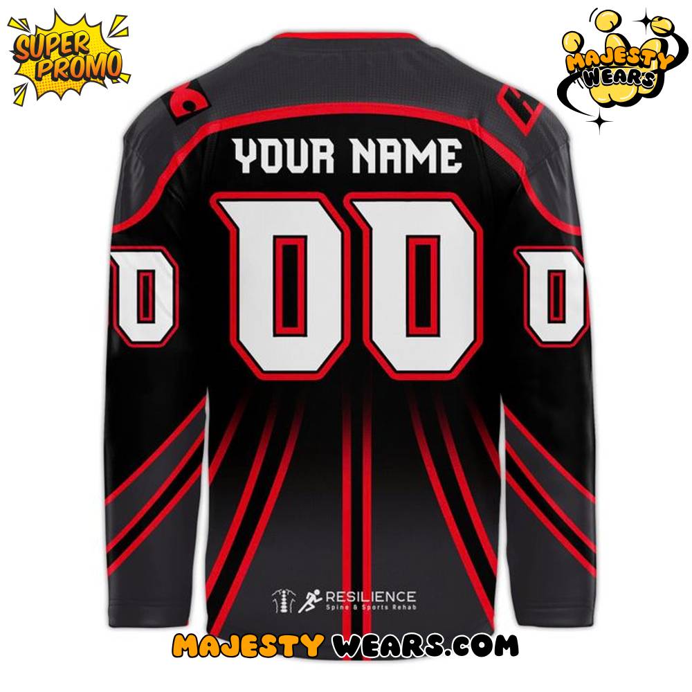 Key design features include the sophisticated striping and color blocking, meticulously adhering to the team’s official palette of black, red, white, and silver. The shoulder yokes are a prominent red, outlined in black, white, and a narrow silver stripe, tapering to a sharp point at the ends to add a dynamic, modern feel. These shoulder elements are not merely decorative; they serve to frame additional logos, with the right shoulder featuring the new ‘HH’ logo and a “liftoff” logo—a rocket between two ‘H’s—subtly placed on the back collar, paying homage to Huntsville’s well-known history as ‘Rocket City’. This level of thoughtful, region-specific detail provides strong Authoritativeness for this Custom Hockey Jersey.