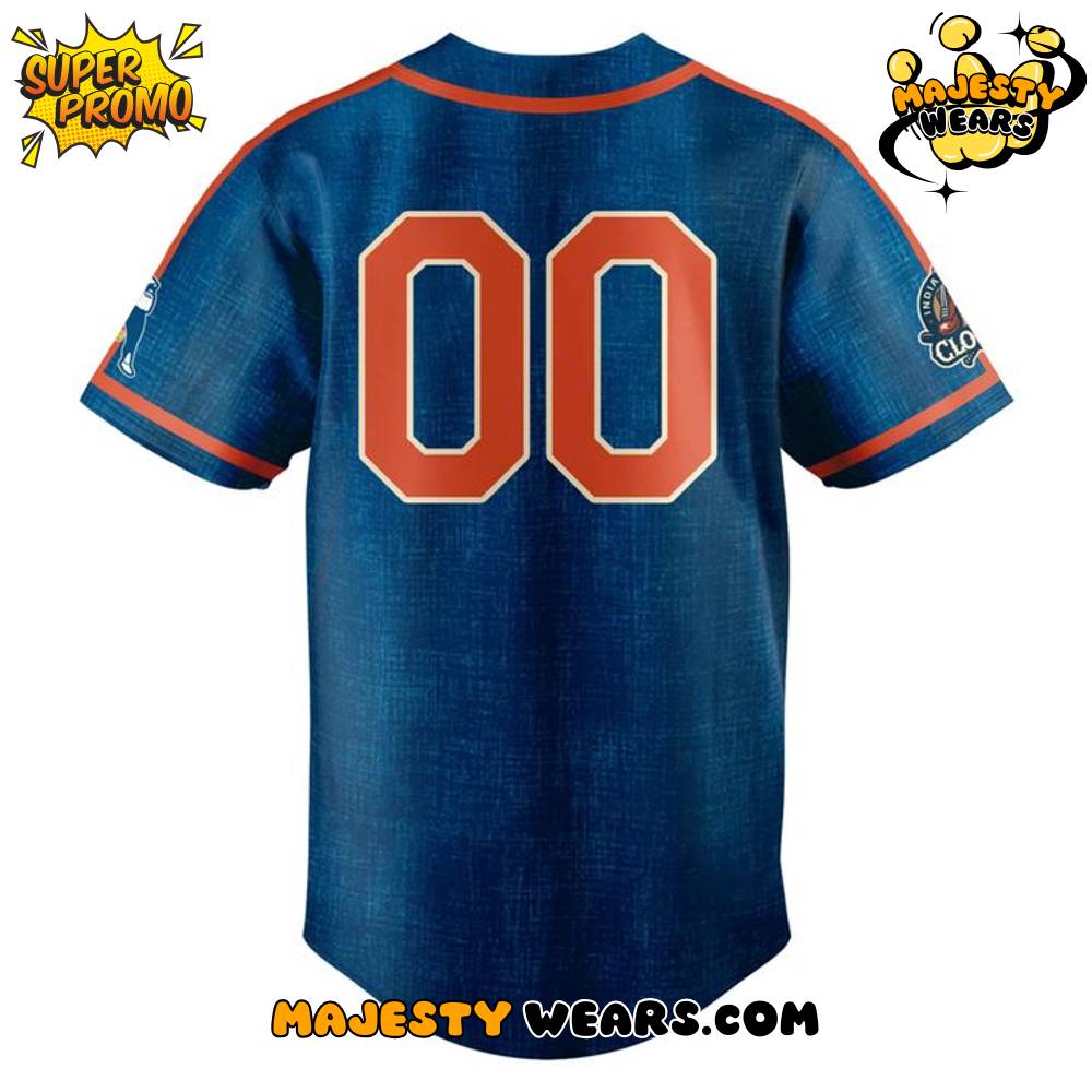 The design of the Indianapolis Clowns Banana Ball Custom Baseball Jersey is a striking combination of traditional baseball aesthetics and bold, memorable branding, as clearly illustrated in the provided images. The jersey features a deep blue base fabric with a slight texture, providing a rich, classic look that still feels modern. Contrasting orange trim adorns the collar, button placket, and sleeve edges, echoing a vibrant color scheme that makes the “CLOWNS” lettering on the chest pop with energy. This attention to detail ensures the custom baseball jersey stands out in any crowd, honoring the team’s colorful history.