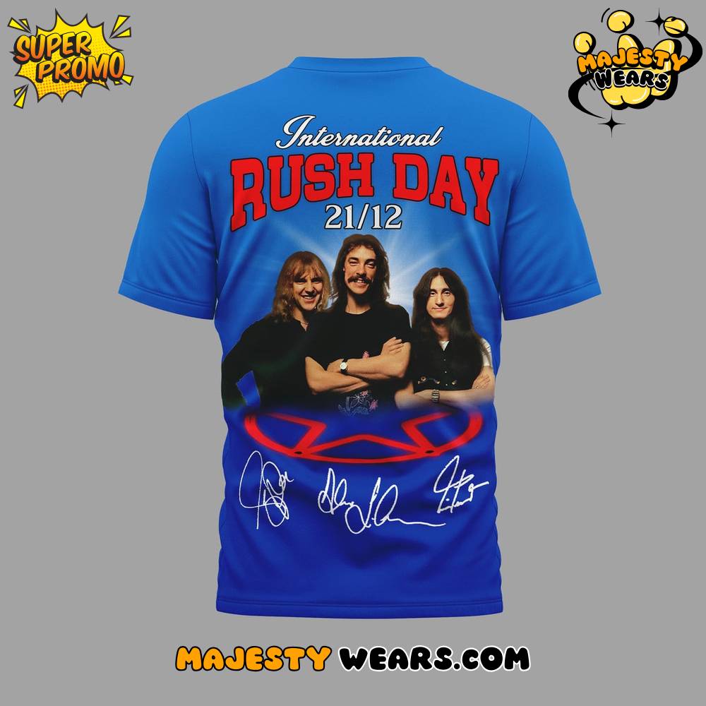 The visual presentation of the International Rush Day T-Shirt is a masterclass in band iconography, featuring high-definition 3D digital printing that captures every nuance of the band’s history. On the front, the International Rush Day T-Shirt prominently displays the classic red “RUSH” logo set against a backdrop of the iconic “Starman” figure within a geometric frame. This International Rush Day T-Shirt utilizes a vibrant royal blue canvas that makes the red and black graphics pop with professional clarity. The meticulous attention to detail on the International Rush Day T-Shirt ensures that the symbols of the band’s mythological storytelling are represented with the highest level of artistic integrity.
