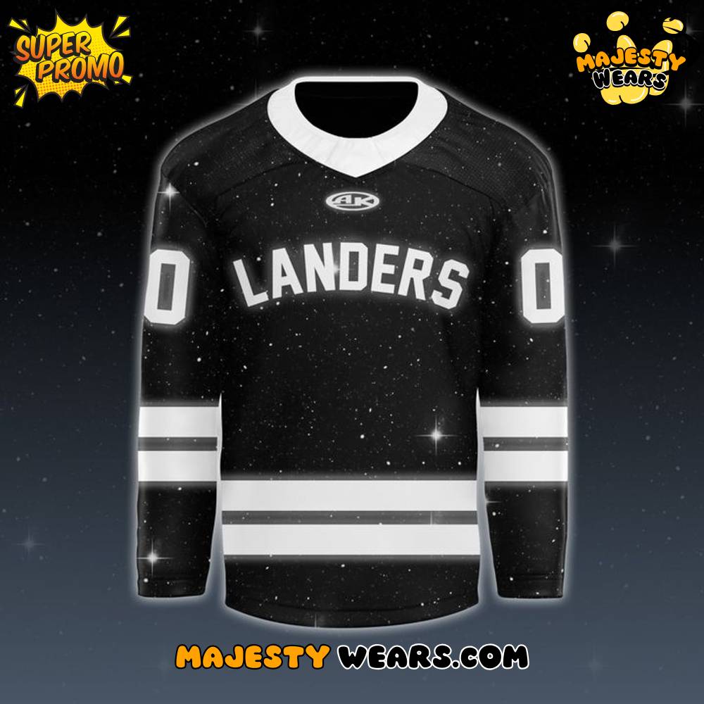 Visually, the Iowa Heartlanders x Star Wars Night Galaxy Custom Hockey Jersey is a masterpiece of thematic design, featuring a deep black base that transitions into a stunning “galaxy” pattern filled with twinkling stars and cosmic nebulae. The front of the Iowa Heartlanders x Star Wars Night Galaxy Custom Hockey Jersey prominently displays the team’s secondary “LANDERS” wordmark across the chest, rendered in a crisp, white font that contrasts sharply against the dark void of the background. Just above this, the iconic Heartlanders deer head logo is positioned with a shimmering aura, seamlessly integrating the team’s fierce identity into the interstellar theme of the Iowa Heartlanders x Star Wars Night Galaxy Custom Hockey Jersey.