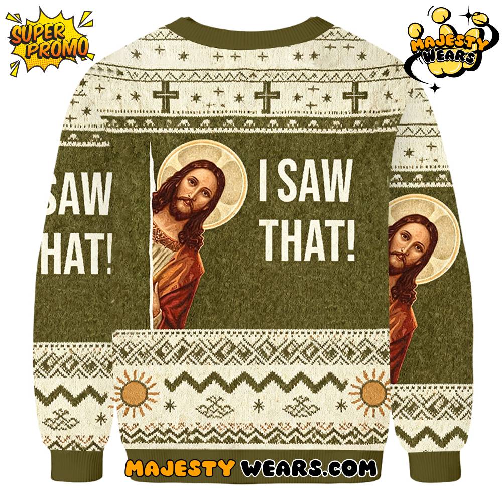 The visual aesthetic of the Jesus I Saw That Ugly Christmas Sweater is anchored by a stunning central graphic depicting Jesus peeking out from behind a door or wall. On the front of the Jesus I Saw That Ugly Christmas Sweater, the illustration is accompanied by the bold, high-contrast text “I SAW THAT!”, instantly recognizable to any fan of humorous holiday gear. This Jesus I Saw That Ugly Christmas Sweater captures the essence of the “ugly” trend by utilizing a rich olive green and cream color palette that feels both vintage and trendy.