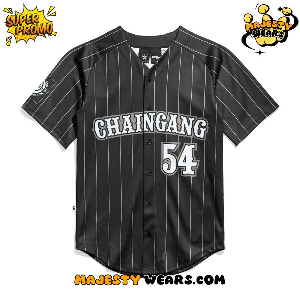 The visual presentation of the John Cena Chain Gang Baseball Jersey – Black is a masterclass in classic sports design, featuring a deep jet-black base accented by sharp, white pinstripes that run vertically across the entire garment. On the front of the John Cena Chain Gang Baseball Jersey – Black, the iconic “CHAINGANG” text is prominently displayed in a bold, silver-outlined varsity font, immediately catching the eye. This John Cena Chain Gang Baseball Jersey – Black also includes the number “54” in a large, matching athletic style, adding to its authentic baseball jersey feel. Every graphic on the John Cena Chain Gang Baseball Jersey – Black is applied with high-precision printing to ensure a crisp and vibrant appearance.