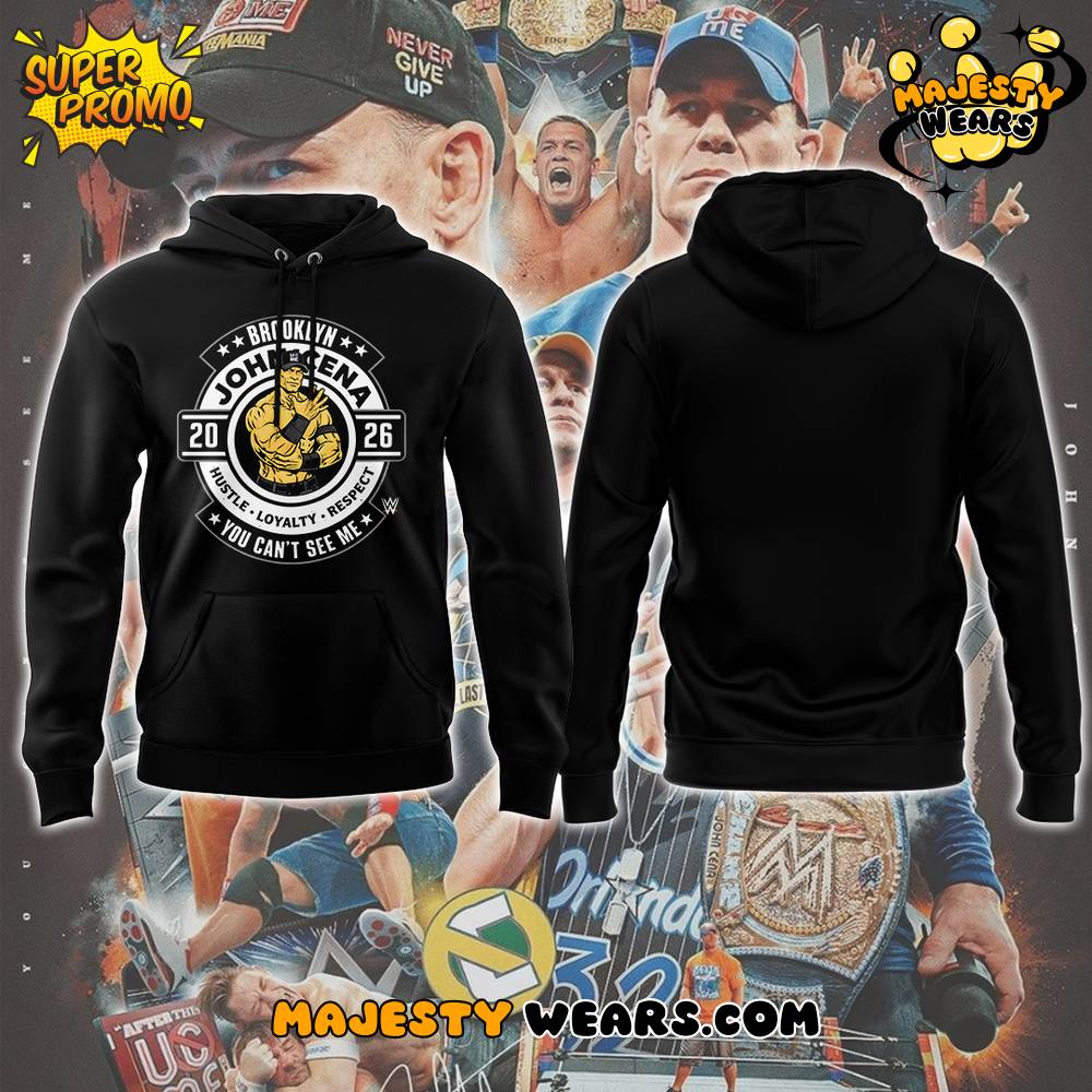 The visual identity of the John Cena x Brooklyn 2026 Hoodie is centered around a bold, circular graphic that captures the essence of the Brooklyn event. In the center of the John Cena x Brooklyn 2026 Hoodie, a powerful illustration of Cena is flanked by the year “2026,” immortalizing his final run in the borough. Surrounding the imagery on the John Cena x Brooklyn 2026 Hoodie are his core values—Hustle, Loyalty, and Respect—along with his iconic catchphrase, “YOU CAN’T SEE ME“.