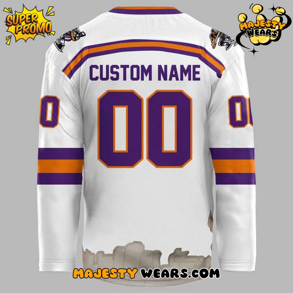 The visual identity of the Knoxville Ice Bear New Season 2025-2026 Custom White Hockey Jersey is defined by its clean white base and vibrant purple and orange accents. As seen in the official designs, the Knoxville Ice Bear New Season 2025-2026 Custom White Hockey Jersey features the redesigned primary crest showing a fierce ice bear in action, wielding a hockey stick with intensity. This Knoxville Ice Bear New Season 2025-2026 Custom White Hockey Jersey utilizes a modern V-neck collar and includes official league-style branding to ensure an authentic on-ice appearance for every fan.