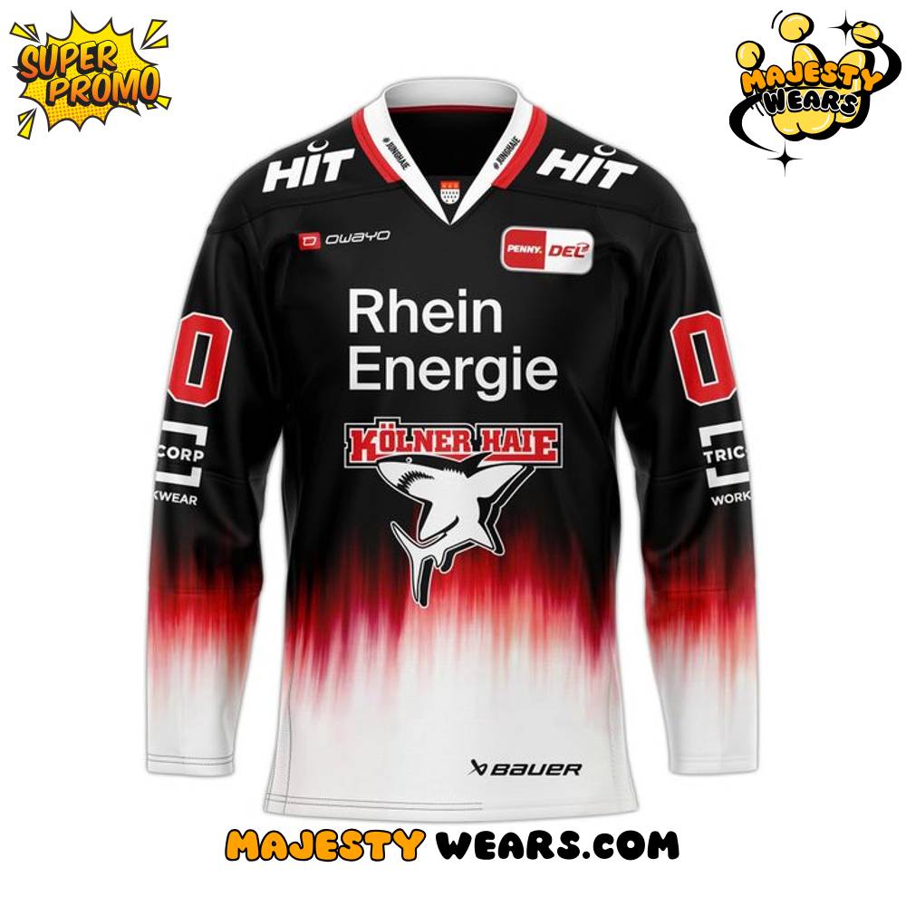 Central to the design is the iconic Kölner Haie logo, featuring the powerful shark silhouette, boldly displayed against the black backdrop on the chest, underlined by the “KÖLNER HAIE” wordmark. Above the logo, the prominent sponsor Rhein Energie is prominently featured, a crucial detail that adds to the authenticity of the Kölner Haie Unser Third Trikot der Saison 2025/2026 Hockey Jersey as a true replica of the team’s on-ice look. The shoulders are adorned with additional sponsor logos, while the collar, which features the red and white accents, includes the Kölner Stadtwappen (City Coat of Arms) on the inside—a hidden tribute to the team’s deep roots in the city of Cologne.