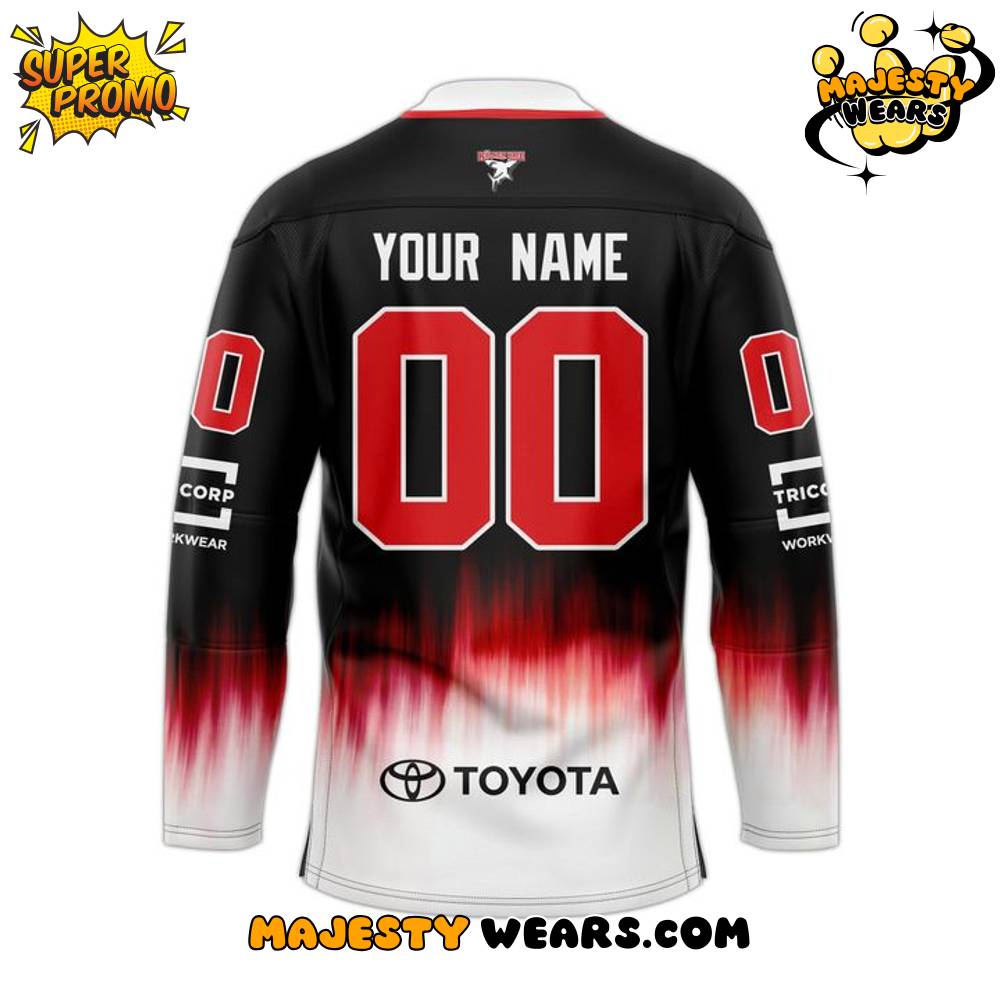 The attention to detail extends to the player customization features of the Kölner Haie Unser Third Trikot der Saison 2025/2026 Hockey Jersey, allowing fans to proudly display “YOUR NAME” above a high-contrast red number on the back, or choose the number of a current player. The numbers on the back and sleeves are rendered in a bold, eye-catching red, contrasting sharply with the black fabric to ensure maximum visibility, embodying the aggressive and focused spirit of the Haie. The prominent Bauer logo near the bottom hem and the Toyota sponsor on the lower back further authenticate the jersey, making it a complete and expertly detailed piece of official fan gear.