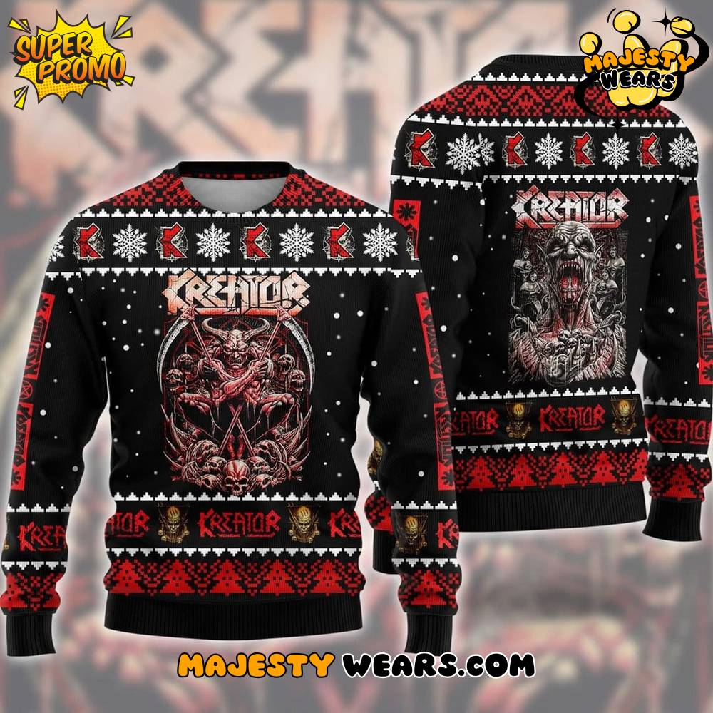 The visual composition of the Kreator TOUR 2026 Sweater features an “ugly Christmas sweater” inspired pattern infused with horrific thrash metal iconography. On the front of the Kreator TOUR 2026 Sweater, the band’s classic logo is positioned above a central graphic of the iconic “Violent Mind” mascot surrounded by skulls. This Kreator TOUR 2026 Sweater incorporates a complex red and white geometric border along the chest and waist, seamlessly blending festive tradition with the dark, occult imagery fans expect from a Kreator release.