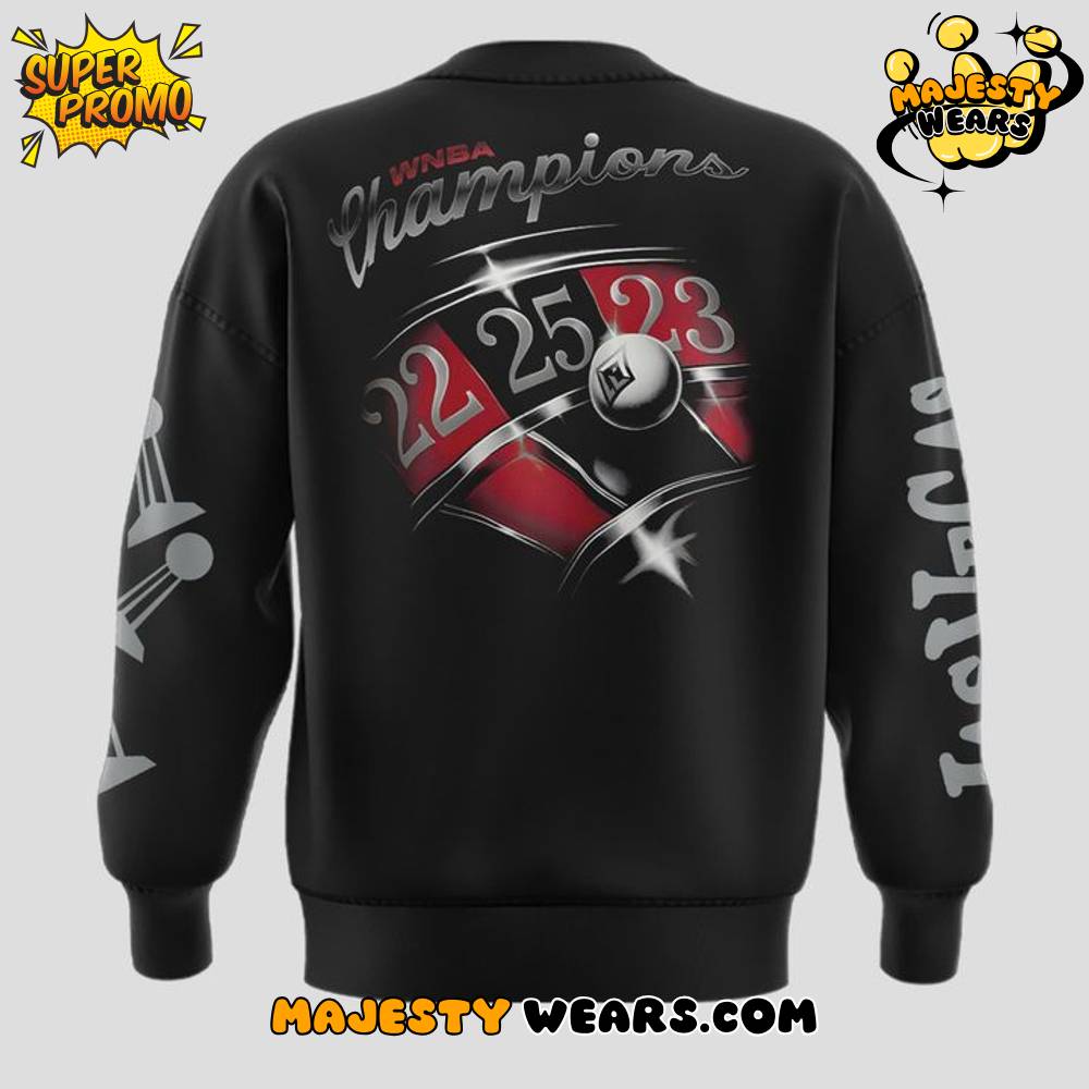 Further elevating the design, the sleeves feature a striking, vertical wordmark of “LAS VEGAS” in a bold, silver font (as seen on the left sleeve), which contrasts sharply with the black fabric. This continuous side print ensures the team’s identity is visible from every angle, making the Las Vegas Aces 2025 WNBA CHAMPIONS Elevated Sweatshirt a dynamic and stylish piece of fan gear. The thoughtful incorporation of the championship years into a signature Las Vegas motif provides an unparalleled piece of memorabilia that champions both the team’s dominance and its vibrant hometown spirit.