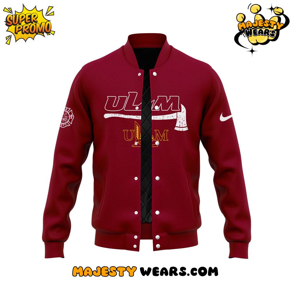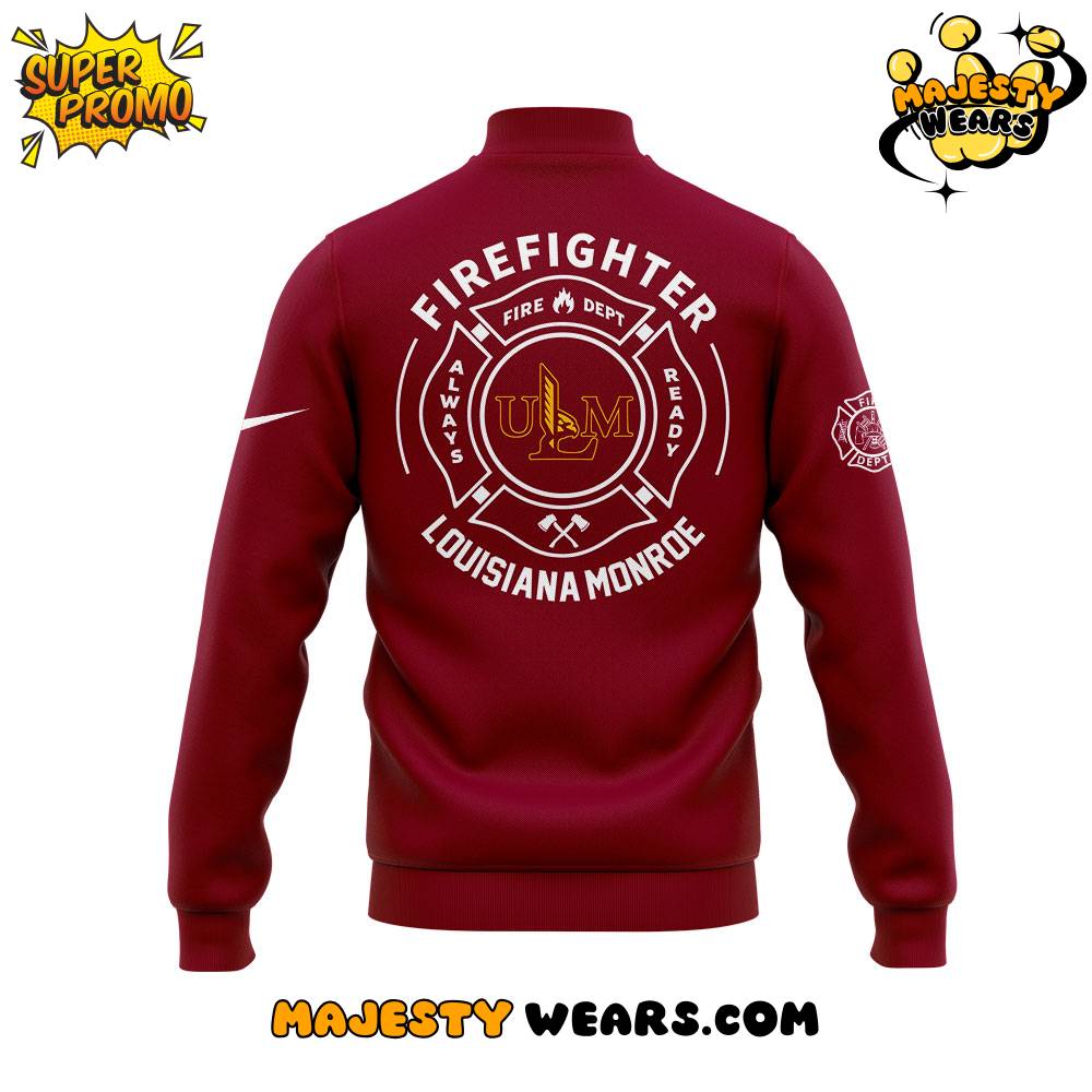The design of the Louisiana-Monroe Firefighter Application Day 2025 Special Hoodie (presented as a jacket-style hoodie) is expertly crafted to be both visually striking and thematically relevant, using the university’s bold maroon color to create a commanding look. The front of the jacket prominently features “ULM” text in white and gold on the chest, ensuring clear identification with the ULM Warhawks athletic program. The jacket’s snap-button front and contrasting black trim suggest a premium, varsity-style fit, providing a modern yet classic aesthetic suitable for wearing to a game or any Firefighter Application Day 2025 event.