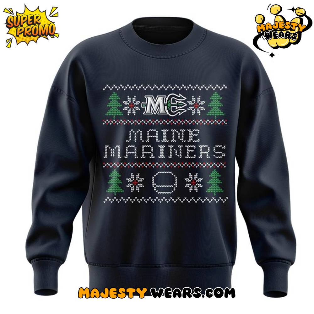 The front of the Maine Mariners 2025 Merry Christmas Sweatshirt is a masterful execution of the “ugly sweater” aesthetic, featuring horizontal bands of knit patterns that alternate team iconography with traditional holiday motifs. Prominently centered is the phrase “MAINE MARINERS” in a bold, eye-catching font, set against a dark blue background. Above and below the text are classic knit elements like stylized Christmas trees, snowflakes, and small team logos or hockey equipment icons, all rendered in the team’s green, white, and red color palette. This balanced, busy design demonstrates the design expertise required for a successful and authentic Ugly Christmas Sweater.
