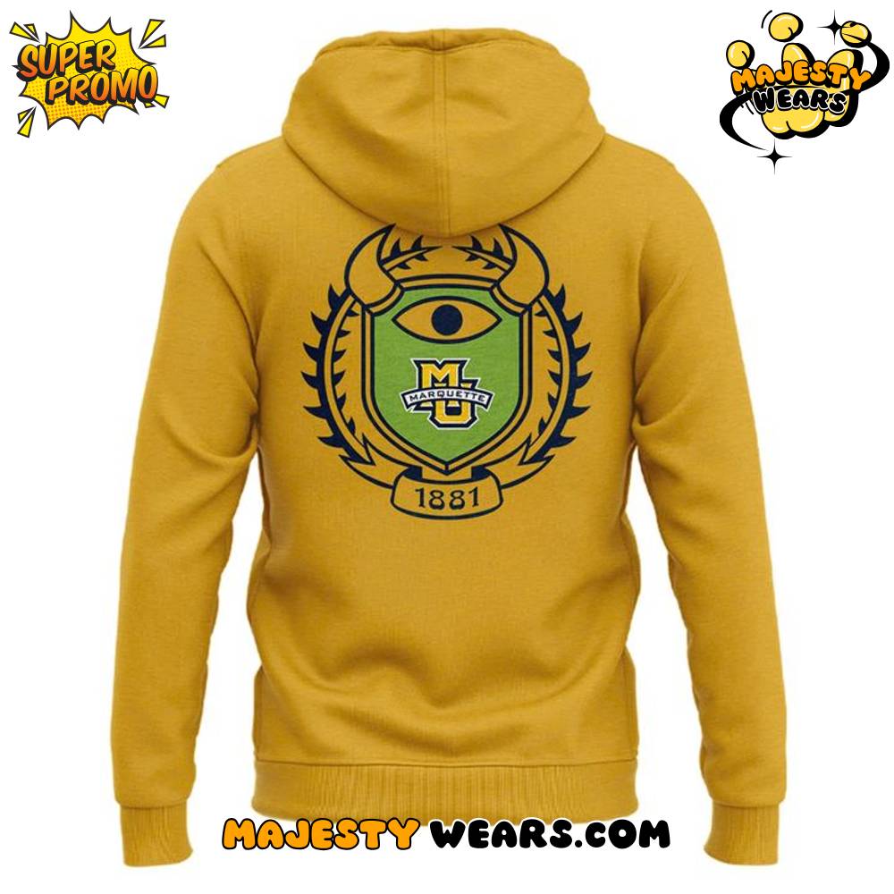 Below the main graphic, the Marquette Golden Eagles x Monsters University Special Hoodie includes a traditional front pouch pocket and drawstring hood, built for practicality and warmth. The quality and color consistency of the fabric used for this Special Hoodie are critical for maintaining the vibrant gold hue, ensuring the apparel looks sharp and lasts for many seasons of fandom. The clean application of the navy blue graphics against the gold provides maximum contrast, making the Marquette Golden Eagles name highly readable and the entire design visually engaging.