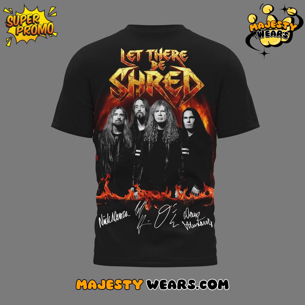 Functional excellence continues on the reverse side of the Megadeth “Let There Be Shred” T-Shirt, which adopts a “tour-style” presentation perfect for the 2026 season. The back of the Megadeth “Let There Be Shred” T-Shirt showcases a full-band portrait under the fiery “Let There Be Shred” slogan, rendered in an aggressive, sharp-edged typeface. This part of the Megadeth “Let There Be Shred” T-Shirt also includes the digital signatures of the current lineup, including Dave Mustaine, providing an extra layer of authenticity. The bottom of the design features realistic licking flames that wrap toward the sides, creating a dynamic, “Winter Warrior” level of visual intensity for the wearer.