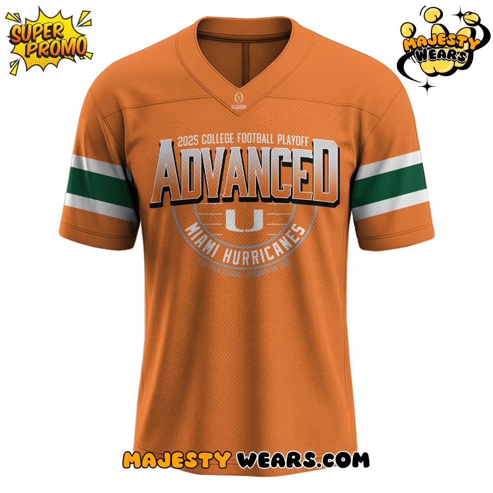 The visual composition of the Miami Hurricanes 2025 College Football Playoff Limited Edition Football Jersey features a striking front-facing graphic that celebrates the team’s advancement. At the center of the Miami Hurricanes 2025 College Football Playoff Limited Edition Football Jersey, the word “ADVANCED” is rendered in a bold, silver-toned font with 3D drop shadows that command attention. This Miami Hurricanes 2025 College Football Playoff Limited Edition Football Jersey also includes the iconic split-U logo and the specific date “December 20, 2025,” marking the pivotal milestone in the team’s quest for the championship.