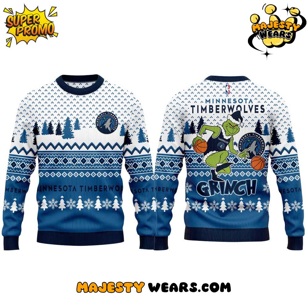 The overall aesthetic of the Minnesota Timberwolves x Grinch Christmas Jumper Ugly Sweater is a classic winter knit style, utilizing a striking combination of white and deep blue to capture both the snowy North Star State environment and the team’s core colors. The design features several layers of familiar “ugly sweater” patterns, including rows of geometric shapes, snowflakes, and festive pine trees, which run across the chest and the bottom hem. The upper chest section proudly displays the circular Minnesota Timberwolves logo against a white, snowy backdrop, setting the scene for this celebratory piece of NBA fan gear.