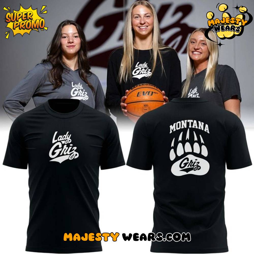 The design of the shirt is bold, instantly recognizable, and perfectly captures the powerful identity of the University of Montana women’s teams. The front features the iconic, flowing “Lady Griz” script logo prominently across the chest in crisp white. This design element ensures immediate recognition and celebrates the distinctive branding associated with the women’s programs, particularly the renowned women’s basketball team. The stark white print on the solid black base provides a high-contrast, professional look that sets this Lady Griz shirt apart.