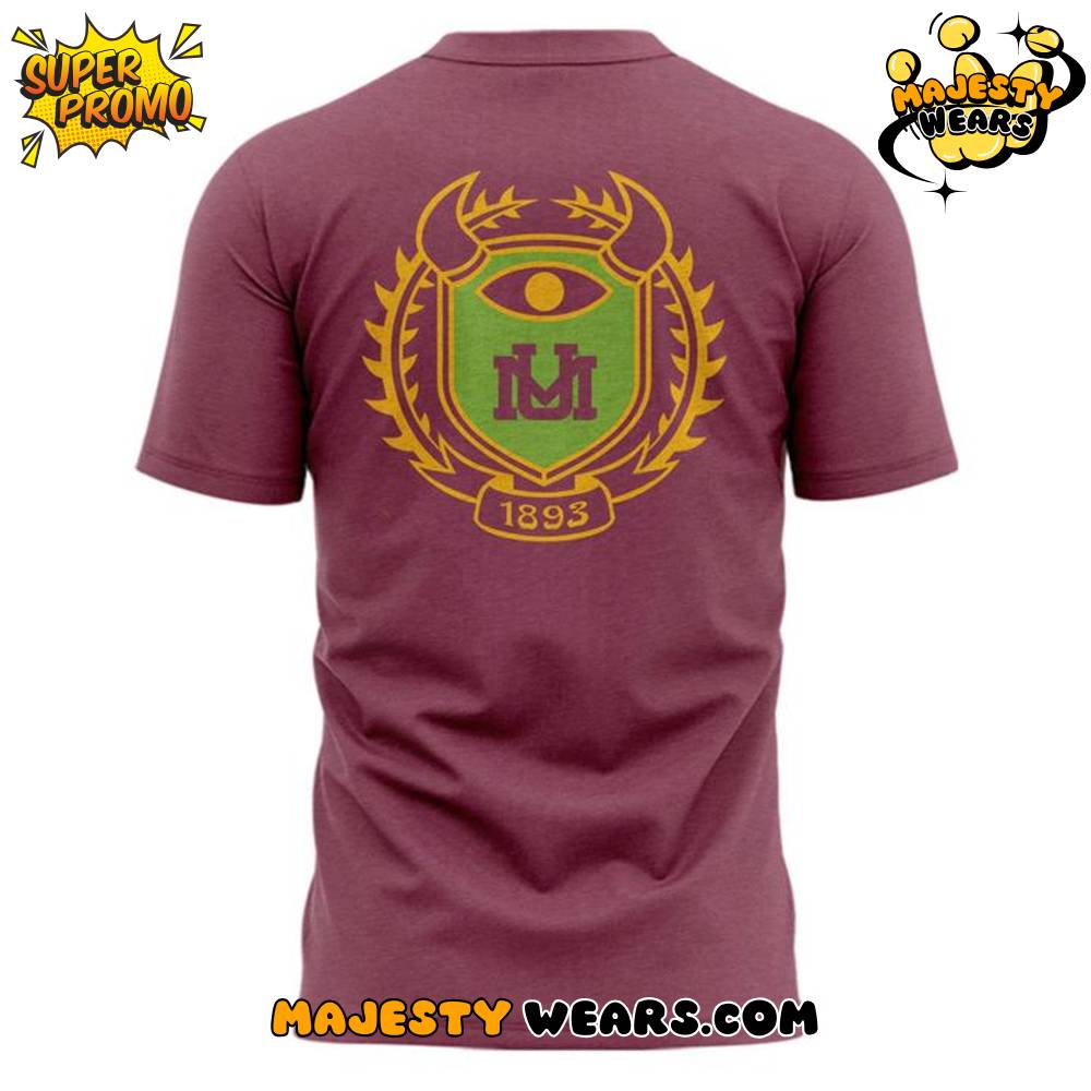 Turning the t-shirt around reveals an even more intricate and authoritative design on the back. A large, ornate crest dominates the back panel, incorporating a stylized green ‘M’ for Montana, an intimidating single eye (Mike’s signature feature), and two grizzly bear claws on top, expertly blending the two mascots into a single cohesive symbol. Beneath the shield, the year “1893” is boldly displayed, referencing the founding year of the University of Montana, which gives the design historical depth and a sense of official, timeless Montana Grizzlies tradition. This detailed back graphic showcases the thoughtful collaboration behind the Monsters University aesthetic.