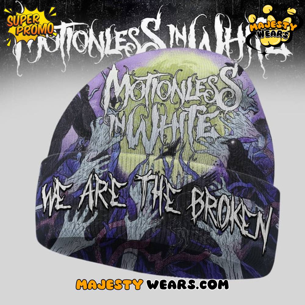 The lower portion of the Motionless in White Special Beanie Hat carries the powerful slogan “We Are The Broken,” a phrase that resonates deeply with the band’s core message of finding strength in vulnerability and community. This text is printed in a bold, weathered font that wraps around the cuff, ensuring that the most important sentiment of the piece is visible regardless of how you choose to style the hat. By incorporating these specific lyrics, the Motionless in White Special Beanie Hat transforms from a simple garment into a symbol of solidarity for fans who identify with the band’s themes of outcasts and misfits. The inclusion of the watchful ravens and the reaching, ghostly hands adds layers of symbolic depth to the Motionless in White Special Beanie Hat, making it a piece of wearable art that tells a story of survival and gothic beauty, perfectly aligned with the band’s visual identity.