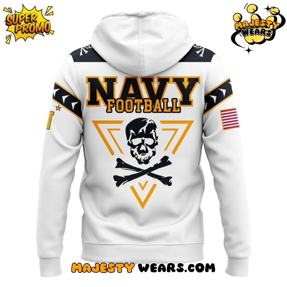 The reverse side of this 250th Birthday Celebration Hoodie continues the theme with a bold graphic featuring “NAVY FOOTBALL” lettering above a large skull and crossbones design, all framed within yellow and black triangular patterns that add a modern, aggressive edge. This dual focus on tradition and modern aesthetic provides Authoritativeness to the design, appealing to both veteran fans and a new generation of supporters. The contrasting white and Black color scheme ensures the graphics stand out, delivering a high-impact visual Experience worthy of the 250th anniversary.