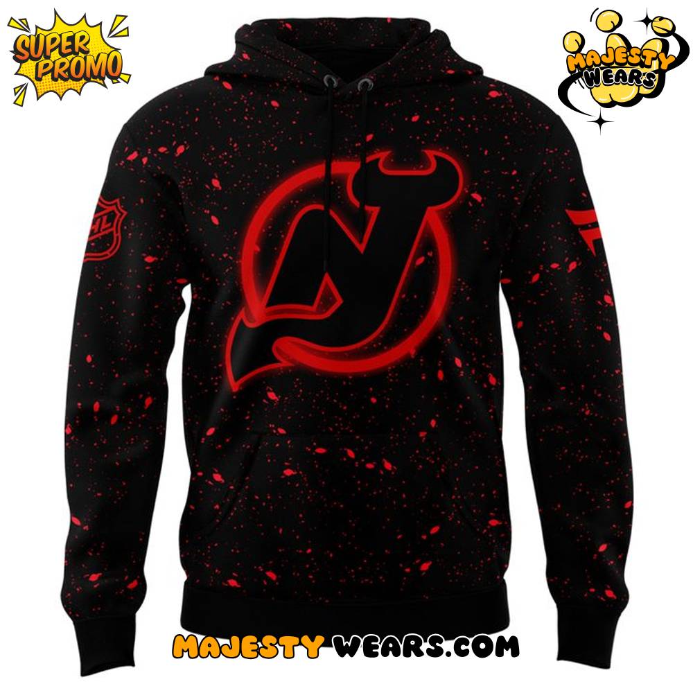 The aesthetic of the New Jersey Devils x Stranger Things Hoodie is defined by a deep black base covered in a striking red “ember” splatter effect that evokes a sense of supernatural chaos. On the front, the New Jersey Devils x Stranger Things Hoodie prominently features the iconic Devils logo rendered in a glowing red outline, centered perfectly on the chest. This central emblem of the New Jersey Devils x Stranger Things Hoodie is complemented by an official NHL shield on the right sleeve, cementing its status as an authentic piece of professional sports merchandise.