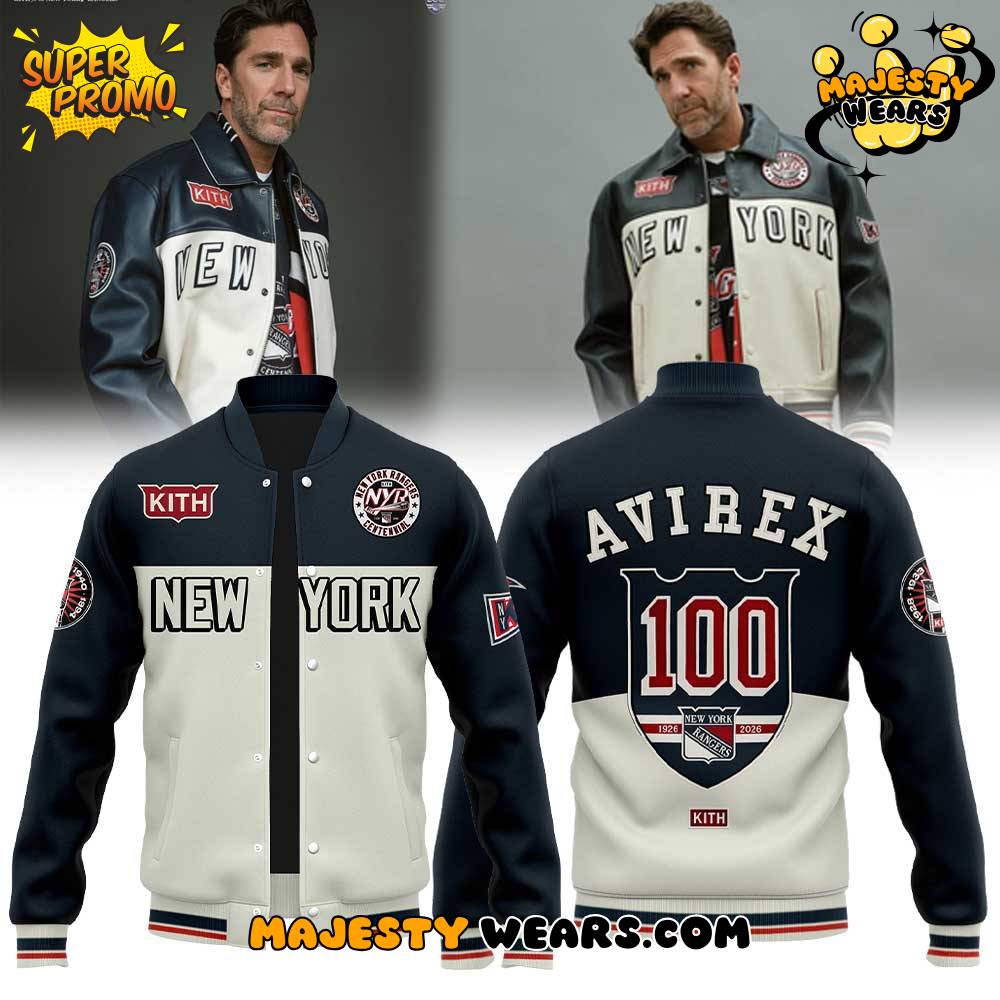 Moving to the back, the New York Rangers Henrik Lundqvist for Kith Special Baseball Jacket showcases a massive, high-definition “AVIREX 100” graphic that dominates the upper shoulders. This intricate scene on the New York Rangers Henrik Lundqvist for Kith Special Baseball Jacket incorporates a central shield featuring the iconic Rangers logo flanked by the dates 1926 and 2026 to mark the hundredth anniversary. Additionally, the New Jersey Devils Gabe Ribeiro’s Los Diablos T-Shirt and the New York Rangers Henrik Lundqvist for Kith Special Baseball Jacket both exemplify how local art and global branding can create a unique “Big Apple” narrative for contemporary sports fans.