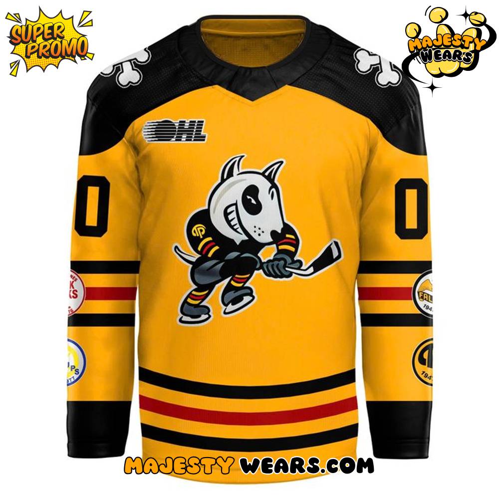 The design of the Niagara IceDogs “80 Years of Bones” Custom Hockey Jersey is a masterclass in modern tribute aesthetics, instantly captivating with its bold black and gold scheme. The prominent chest crest features a determined, stick-wielding bulldog mascot, rendered in a classic style that conveys both ferocity and charm, immediately signaling the authoritativeness of the IceDogs brand. The vibrant gold body and black shoulders are separated by a distinctive bone pattern—a clever nod to the “Bones” motif—that runs across the shoulder yoke, showcasing the garment’s specialized expertise.
