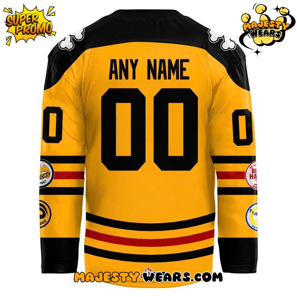 This commemorative jersey is crafted with high-quality materials to provide the look and feel of authentic on-ice equipment, ensuring long-lasting durability and comfort. The striking color palette of deep black and vibrant gold is meticulously chosen to honor the “80 Years of Bones” theme, providing a visual connection to the team’s historical identity. This commitment to quality and historical accuracy builds trustworthiness with the OHL community and dedicated supporters. Whether you’re attending a game at the Meridian Centre or displaying it in your fan cave, this Niagara IceDogs custom jersey is a true testament to the legacy of the IceDogs.