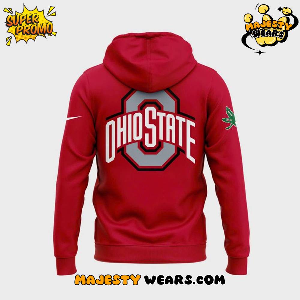 The reverse side of the Ohio State Buckeyes x Peanuts Night 2025 Special Hoodie provides a bold, traditional display of Ohio State Buckeyes Football pride, ensuring the garment is easily recognizable as official team gear. The prominent graphic on the back is the classic OHIO STATE logo, featuring the stylized block ‘O’ with the word “STATE” subtly integrated, presented in a crisp red, gray, and white color scheme. This strong, clean logo design provides a powerful visual contrast to the playful nature of the front graphic, confirming the hoodie’s status as authentic merchandise for the passionate Buckeye Nation.