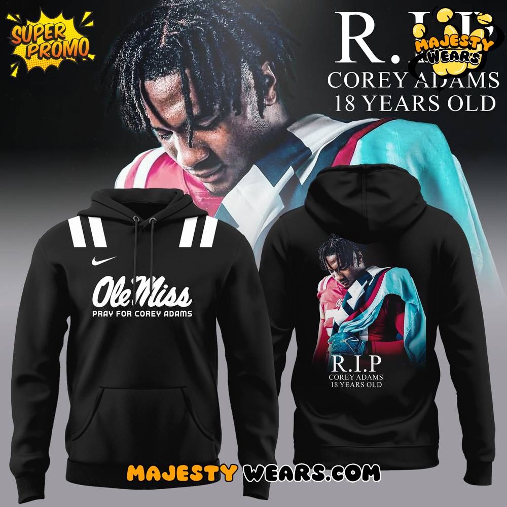 The back of the Ole Miss Rebels hoodie offers the most personal and impactful element of the tribute, featuring a prominent, high-resolution image of Corey Adams, artfully draped with the team’s red and blue colors. This powerful photograph is carefully integrated into the design, providing a human face to the tragedy and deepening the emotional resonance for the wearer. Below the image, the text “R.I.P. COREY ADAMS 18 YEARS OLD” is clearly printed, offering the essential details of the loss. This authoritative and expert-designed back panel ensures the focus remains on honoring Corey and providing a trustworthy commemorative piece in 2025.