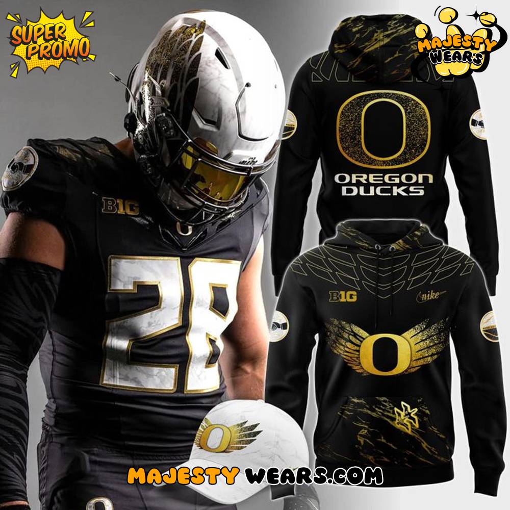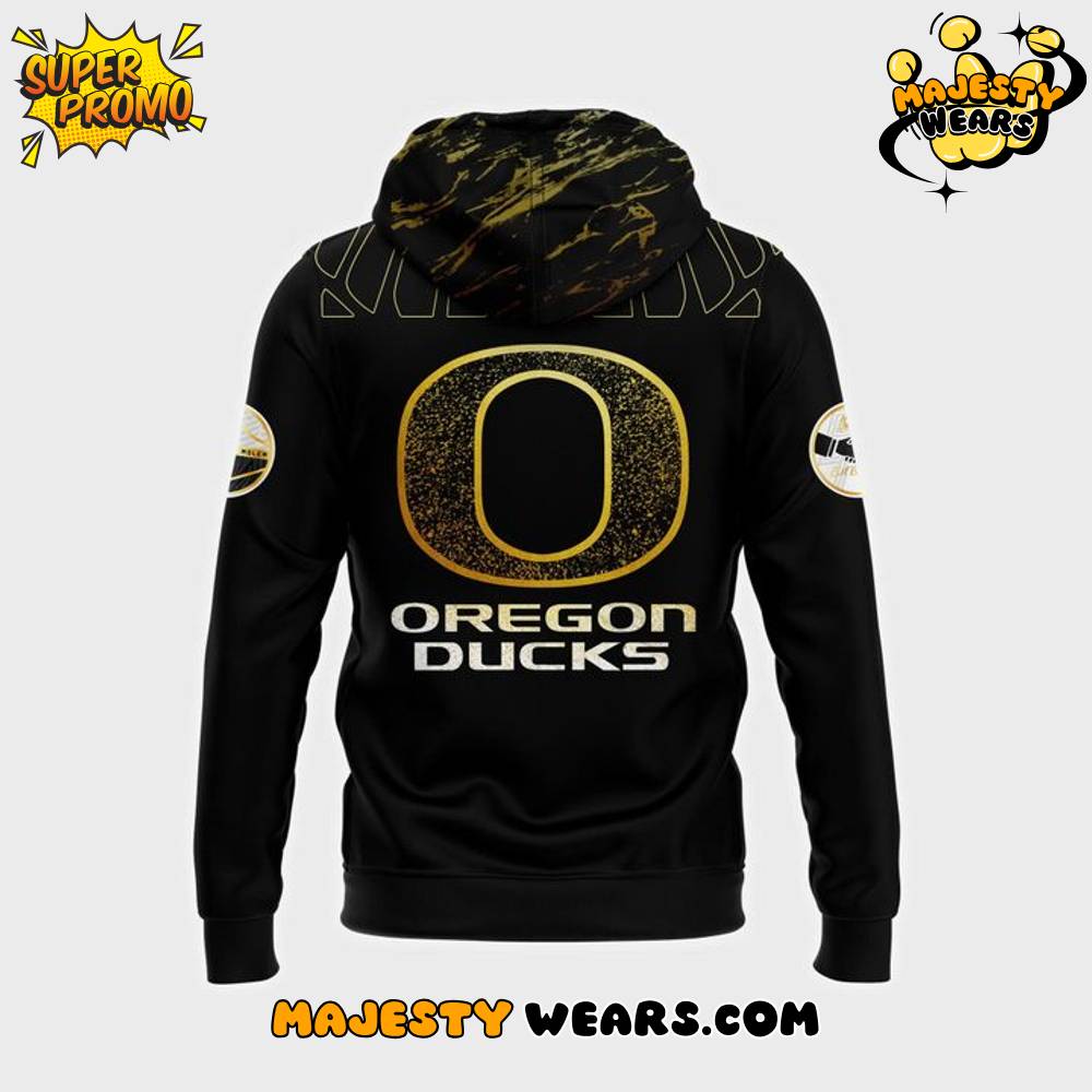 The design of the Oregon Ducks “Shoe Duck” uniform 2025 Special Hoodie is a masterclass in visual storytelling. The hoodie’s base color is anthracite, a deep black that provides a sleek, modern foundation for the gold highlights. This color scheme, along with the project’s name, was inspired by the cover of Phil Knight’s autobiography, “Shoe Dog”. The front features a prominent, metallic-gold team logo, providing a striking contrast that is both elegant and bold. The carefully selected colors and fonts used on this 2025 Special Hoodie create a look that is sophisticated while still celebrating the team’s identity.