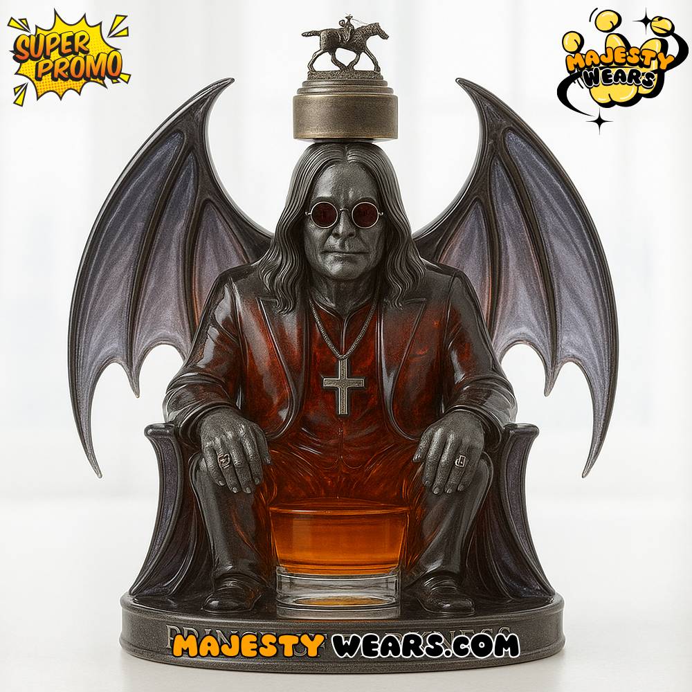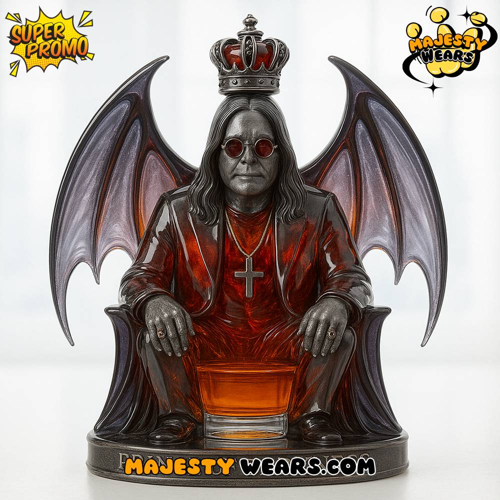 The visual design of the Ozzy Osbourne “Prince of Darkness” Whiskey Bottle is truly breathtaking, featuring a high-relief sculpture of Ozzy himself seated upon a throne of shadows. This custom Ozzy Osbourne “Prince of Darkness” Whiskey Bottle is defined by massive, unfurled bat wings that extend from the back, creating a silhouette that is instantly recognizable to any fan. The Ozzy Osbourne “Prince of Darkness” Whiskey Bottle uses a dark, gunmetal finish on the exterior sculpture, providing a stark, dramatic contrast to the rich amber liquid visible in the central reservoir.