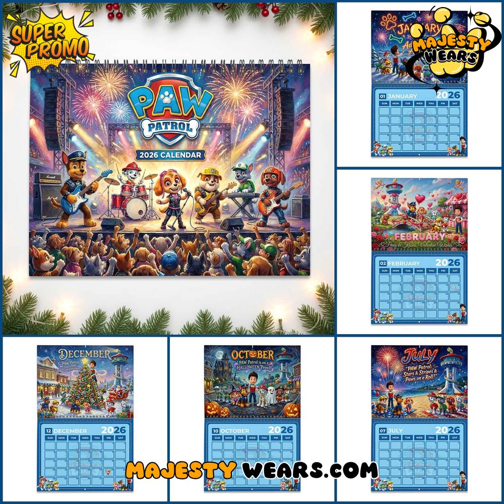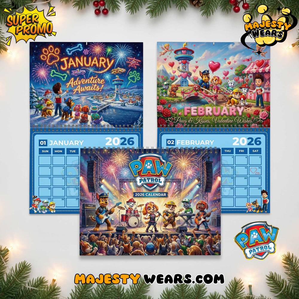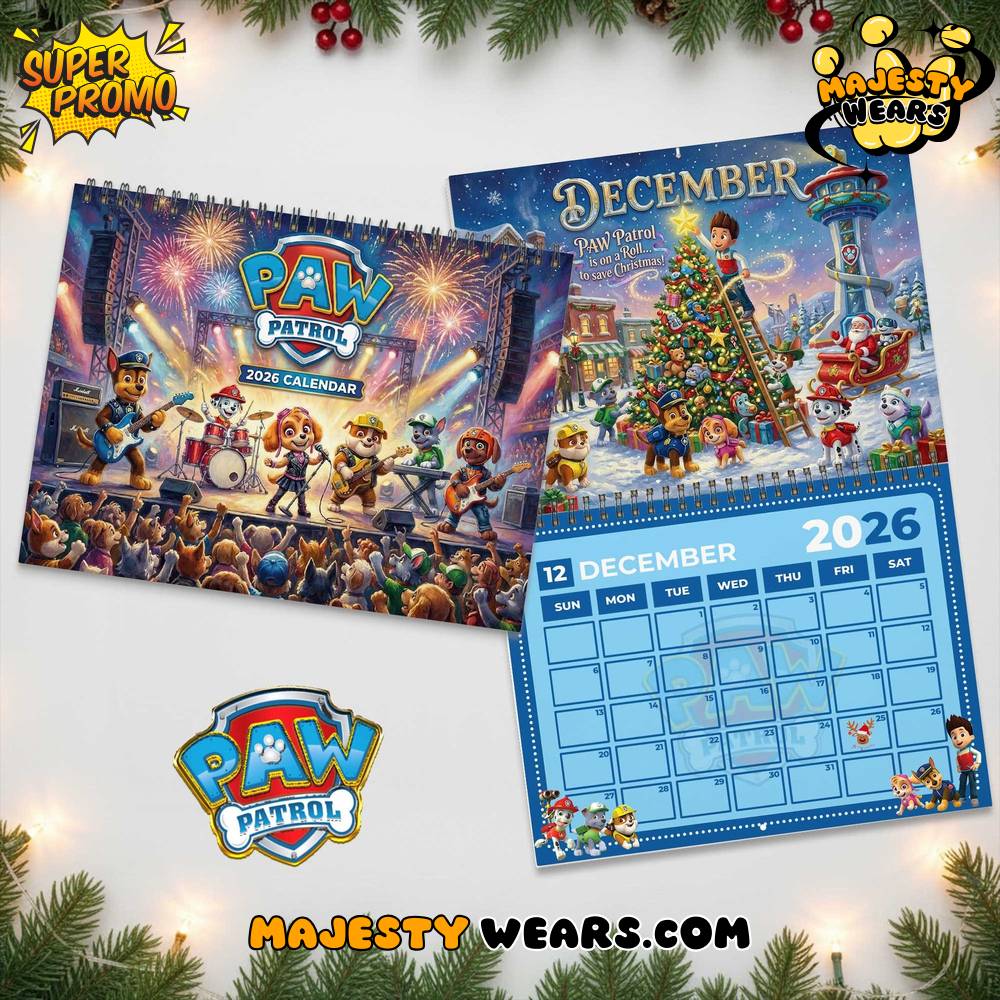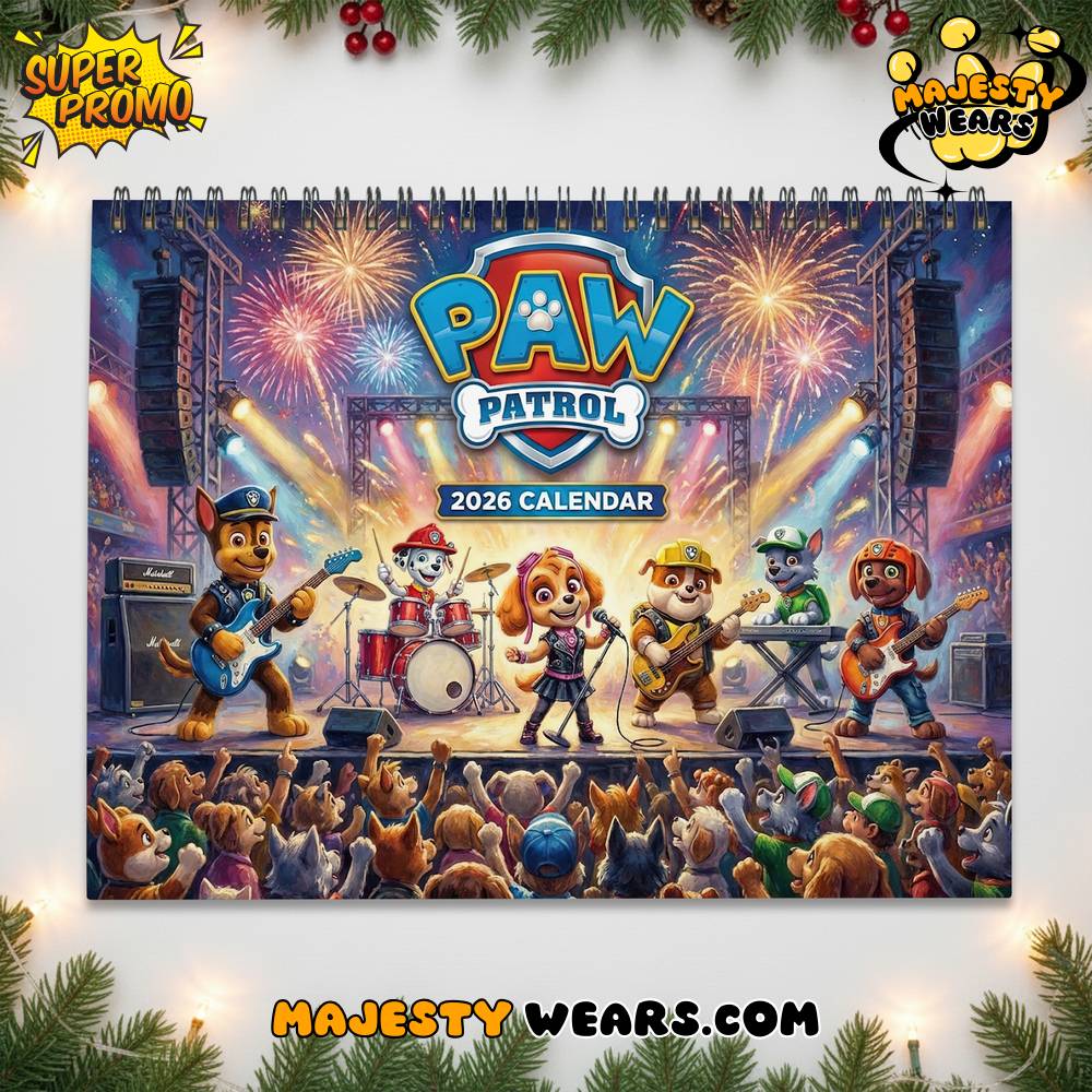 The visual appeal of the Paw Patrol 2026 Wall Hanging Calendar is immediately evident from its striking cover, which features the pups rocking out on stage. This specific Paw Patrol 2026 Wall Hanging Calendar showcases Chase on guitar and Marshall on drums, surrounded by dazzling pyrotechnics and a cheering crowd. The high-resolution printing used in the Paw Patrol 2026 Wall Hanging Calendar ensures that every character’s uniform and vehicle looks as sharp as they do on screen. This energetic “rockstar” theme sets a positive and vibrant tone for the year, making the calendar a standout piece of wall decor in any room.